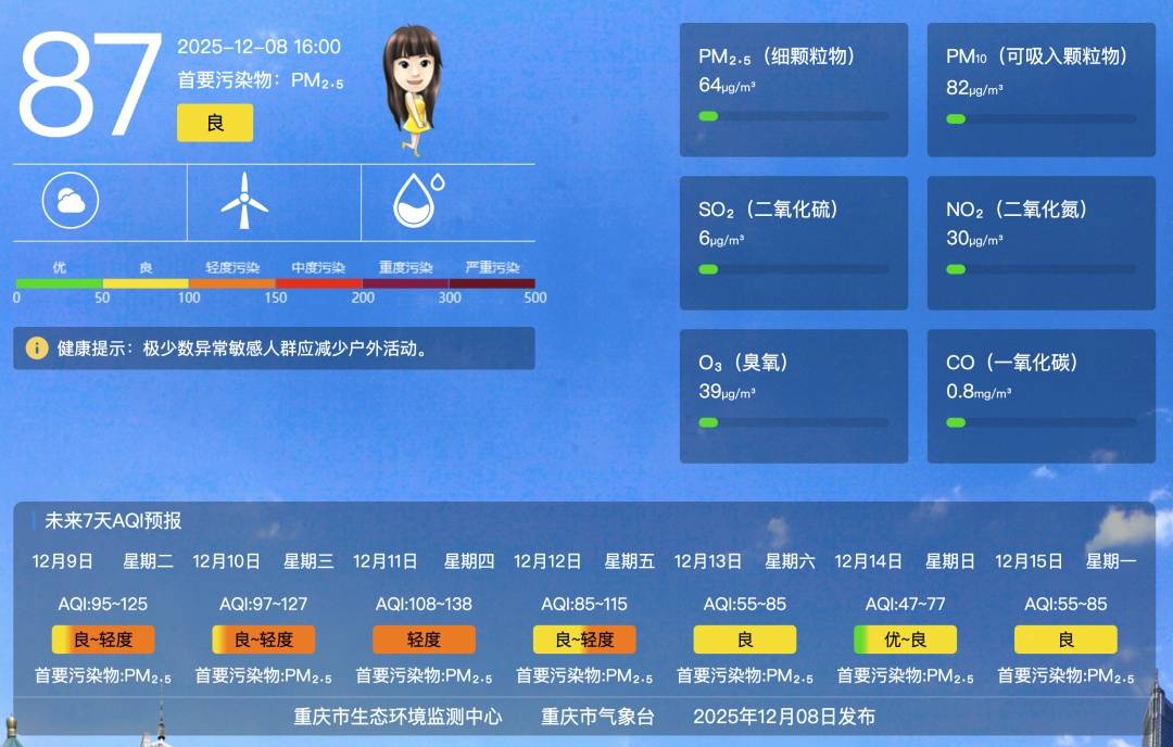应对空气污染是一场需要科学施策、部门联动、全民参与的攻坚战。每年的12月到次年的2月,重庆市都容易出现大气污染,首要污染物为PM2.5,市生态环境局都将提前发布预警信息。污染应对期间,我市各级各部门也会采取强制减排措施和倡导减排措施,最大限度减缓污染累积速度、缩短污染时长、降低污染峰值。请广大市民朋友理解、支持并积极配合,既做好自我健康的第一责任人,也争做绿色生活的践行者。让我们共同努力,守护重庆的美丽蓝天。