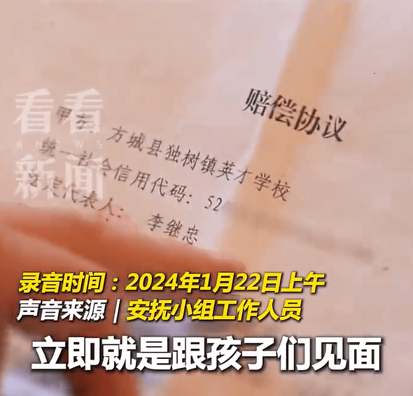 范永归表示,安抚小组暗示,如果不签这个协议就见不到孩子,只要签了这个协议,就可以马上去殡仪馆见到孩子。范永归的说法也得到了其他遇难者家属的印证。还有家属告诉记者,当时如果不尽快签协议,赔偿金额还会降低。有家属向我们提供了一份当时的现场录音。1月22日,范永归在签署协议后,当天就被允许进入殡仪馆见孩子,后续也收到了协议承诺的赔偿金。