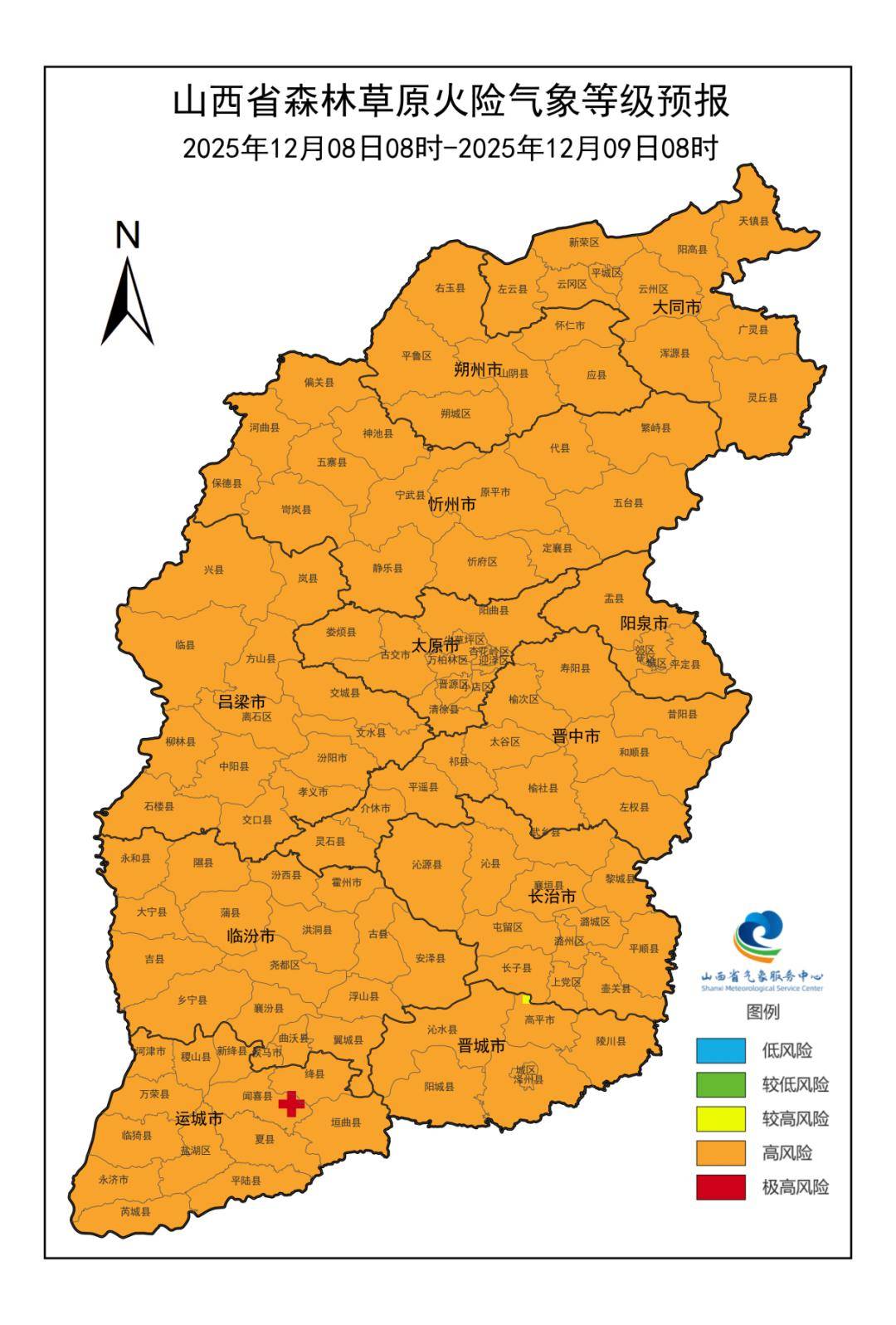 山西大部地区高火险级别(禁止野外用火),局部地区极高火险级别(严禁野外用火)。