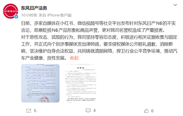 快科技12月9日消息,东风日产法务日前发文称,多家自媒体在小红书、微信视频号等社交平台发布针对东风日产N6的不实言论,恶意贬损N6产品形象和商品声誉,更对我司名誉权造成了严重损害。