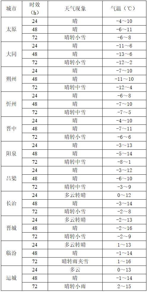 12月8日07时至9日07时,全省各地最低气温介于-21.4℃(新荣区)~1.0℃(平陆)之间。太原、大同、阳泉、长治、晋城、朔州、晋中、忻州和吕梁的全域,运城和临汾的大部共114个县(市、区)最低气温在0℃以下,其中,右玉、新荣区在-20℃以下,大同、朔州、忻州、太原、吕梁、晋中、长治有31个县(市、区)在-20~-10℃之间。