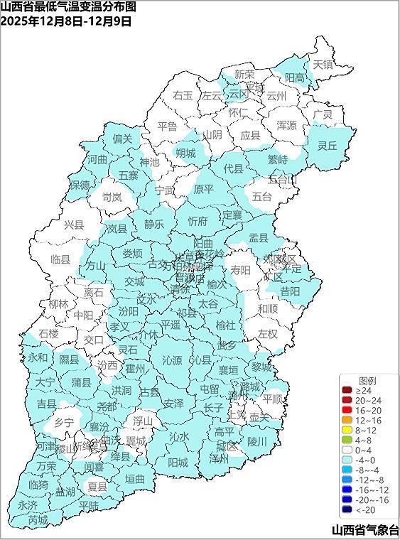 以24小时最低气温降幅统计,截至12月9日07时,太原、晋城、晋中、运城、忻州和临汾的大部,大同、阳泉、长治和吕梁的部分,朔州的局部共73个县(市、区)出现幅度为0.1~2.0℃的降温;其余地区出现小幅升温。