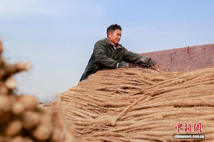 大雪时节,河南商丘睢县西陵寺镇孟楼村山药种植基地内,农户忙着采挖、分拣、运输成熟的山药,呈现出一派繁忙景象。图为12月8日,农户将采挖的山药装车。 徐泽源 摄