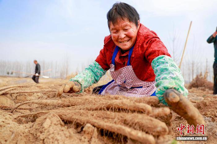 大雪时节,河南商丘睢县西陵寺镇孟楼村山药种植基地内,农户忙着采挖、分拣、运输成熟的山药,呈现出一派繁忙景象。图为12月8日,农户在采挖山药。 赵洁 摄