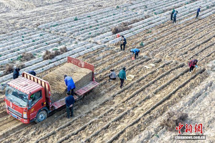 大雪时节,河南商丘睢县西陵寺镇孟楼村山药种植基地内,农户忙着采挖、分拣、运输成熟的山药,呈现出一派繁忙景象。图为12月8日,农户在采挖山药。(无人机照片) 徐泽源 摄