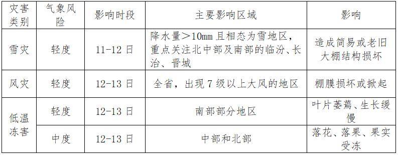 此次天气过程影响范围广,预计11-12日降水量>10mm且相态为雪的地区塑料大棚存在轻度雪灾风险,尤其一些结构简易或老旧的大棚。12-13日,设施塑料大棚存在轻度风灾风险,易造成棚膜损坏、掀起;瓜果类蔬菜存在轻-中度低温冻害风险,易造成植株叶片卷曲、生长缓慢,落花落果、果实受冻。