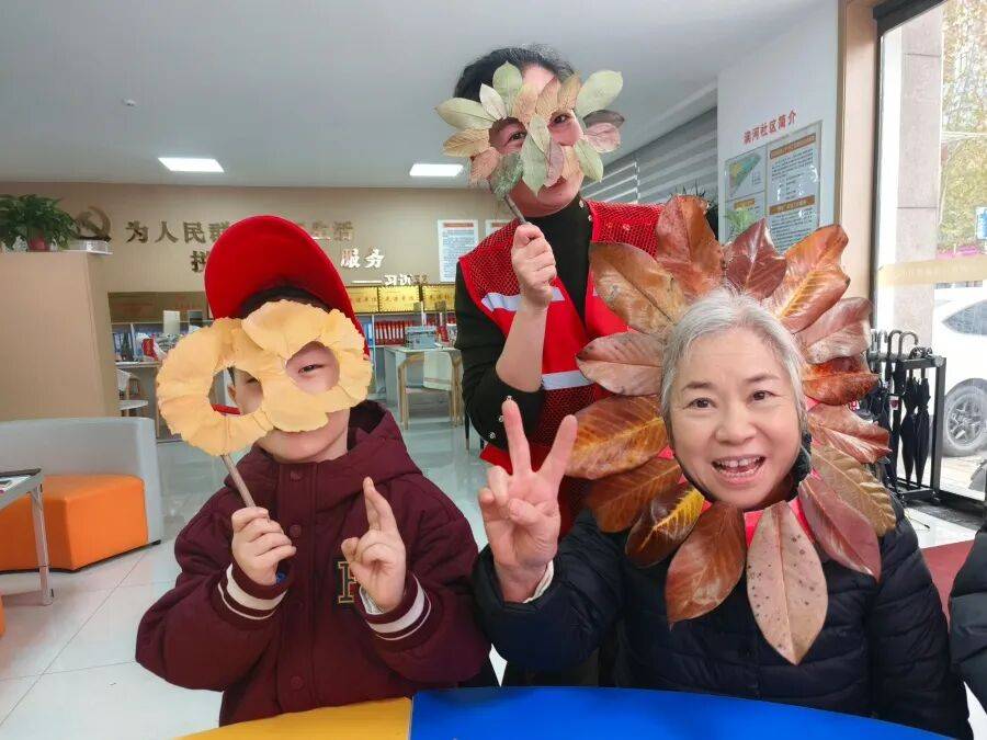 活动伊始,宣讲员在社区活动室为居民们带来了一场生动的《党的二十届四中全会精神》理论政策宣讲。宣讲深入浅出,用通俗易懂的语言和鲜活生动的事例,将党的创新理论与百姓的日常生活紧密联系,让宏伟蓝图与社区愿景同频共振,切实推动了党的创新理论“飞入寻常百姓家”,赢得了在场居民的阵阵掌声。结合幼儿园生态启蒙教育特色,志愿者们化身“环保小卫士”,与社区老人们结伴围坐在一起,将收集来的落叶变成了艺术创作的珍宝。在党员志愿者和小朋友们的陪伴与协助下,孩子们天马行空的想象力与老人们沉稳的生活智慧相互碰撞,共同创作出一件件独一无二的自然艺术品。老人们戴上和孩子们亲手制作的“落叶皇冠”,脸上绽放出如孩童般灿烂的笑容,活动现场洋溢着跨越年龄的亲情与温暖。