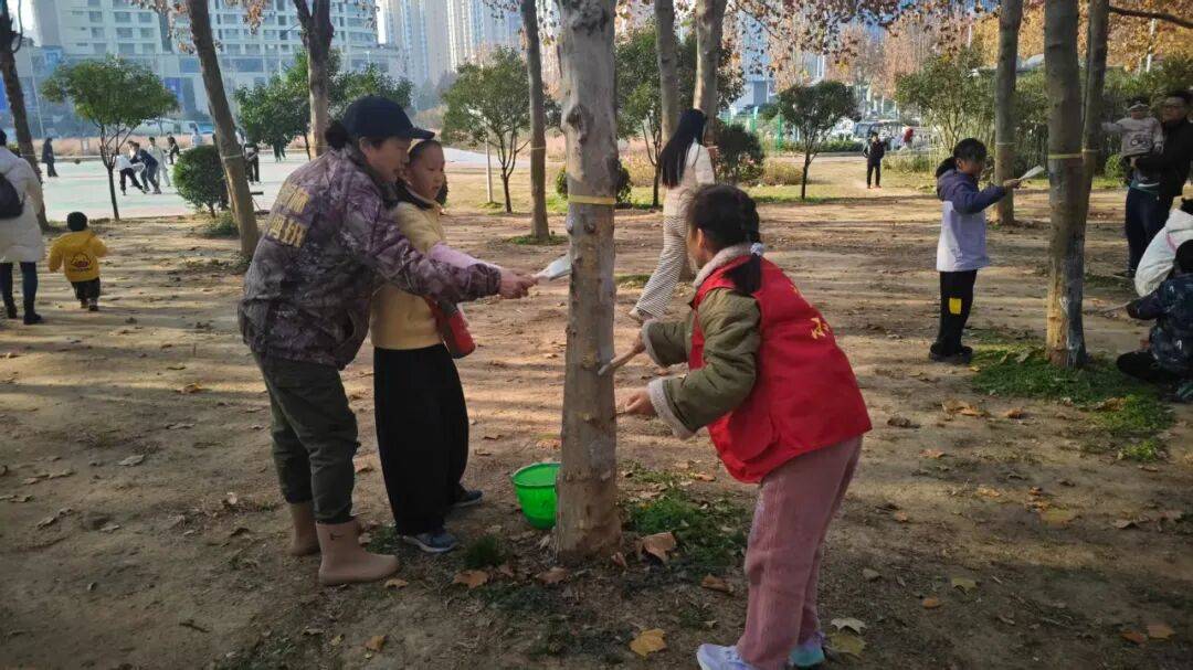 活动现场,全民健身公园管理所的工作人员化身“自然导师”,言传身教地为小记者们讲述树木刷白的双重价值:既能帮小树抵御刺骨寒风,又能驱赶啃食树皮的虫害,是冬日里树木的“防寒防虫保护伞”。从涂料调配到涂刷技巧,工作人员手把手示范,细致讲解每一个操作细节,让小记者们快速掌握护树要点。随后,小记者们手持工具,踮着脚尖、认真地将白色涂料均匀刷在树干上,“沙沙沙”的涂刷声里,一棵棵小树渐渐穿上了整洁的“冬衣”。寒风中,孩子们的脸颊冻得微红,却难掩参与实践的热情,稚嫩的动作里满是对生命的呵护。