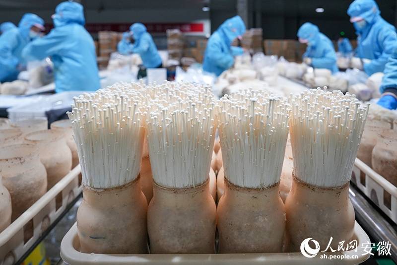 人民网铜陵12月9日电 (记者苗子健)日前,在铜陵国家农业科技园区内的安徽康恒生物科技公司食用菌生产车间,工人们在流水线上采收金针菇供应市场。