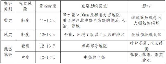此次天气过程影响范围广,预计11-12日降水量>10mm且相态为雪的地区塑料大棚存在轻度雪灾风险,尤其一些结构简易或老旧的大棚。12-13日,设施塑料大棚存在轻度风灾风险,易造成棚膜损坏、掀起;瓜果类蔬菜存在轻-中度低温冻害风险,易造成植株叶片卷曲、生长缓慢,落花落果、果实受冻。