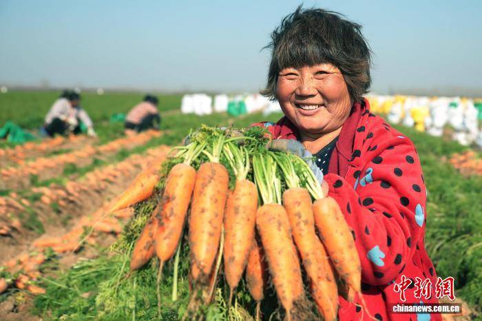 孟冬时节,河南多地农民抢抓农时,有序开展冬季农业生产。图为12月7日,开封尉氏县张市镇张市村农户在种植园内收获红萝卜。 李新义 摄