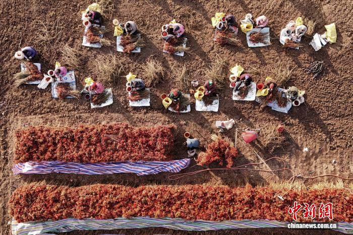 孟冬时节,河南多地农民抢抓农时,有序开展冬季农业生产。图为12月6日,平顶山宝丰县闹店镇李官营村农民在分拣辣椒。(无人机照片) 何五昌 摄