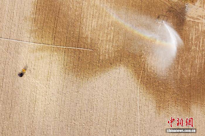 孟冬时节,河南多地农民抢抓农时,有序开展冬季农业生产。图为12月9日,在周口市城乡一体化示范区搬口街道黄许庄村,农户为刚播种的小麦田灌溉以促其发芽。(无人机照片) 刘俊涛 摄