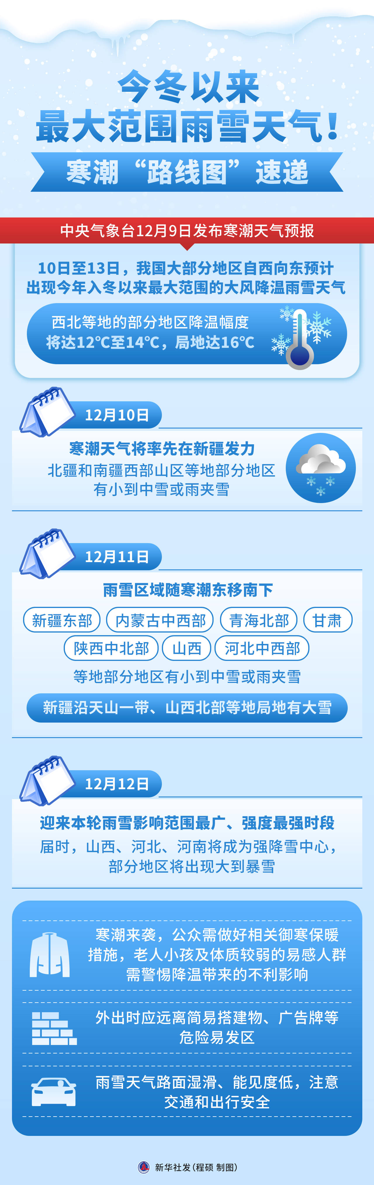 中央气象台12月9日发布寒潮天气预报,10日至13日,我国大部分地区自西向东预计出现今年入冬以来最大范围的大风降温雨雪天气,西北等地的部分地区降温幅度将达12℃至14℃,局地达16℃。