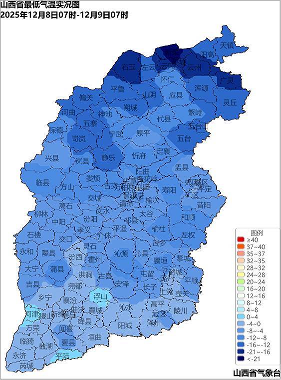 12月8日07时至9日07时,全省各地最低气温介于-21.4℃(新荣区)~1.0℃(平陆)之间。太原、大同、阳泉、长治、晋城、朔州、晋中、忻州和吕梁的全域,运城和临汾的大部共114个县(市、区)最低气温在0℃以下,其中,右玉、新荣区在-20℃以下,大同、朔州、忻州、太原、吕梁、晋中、长治有31个县(市、区)在-20~-10℃之间。