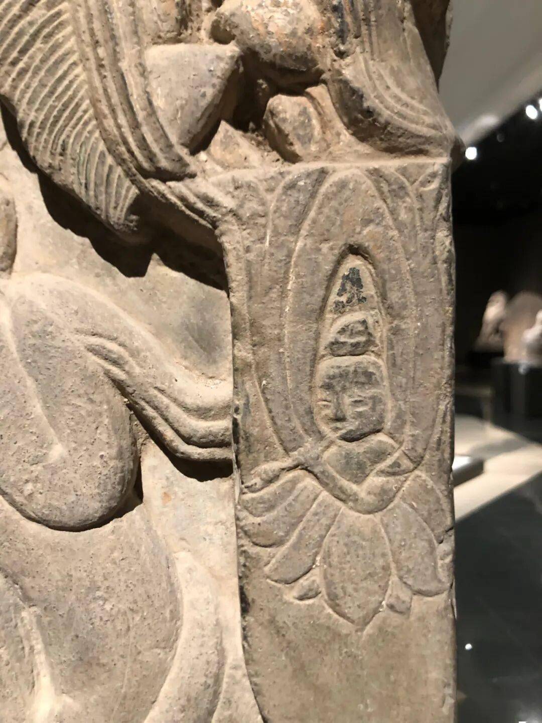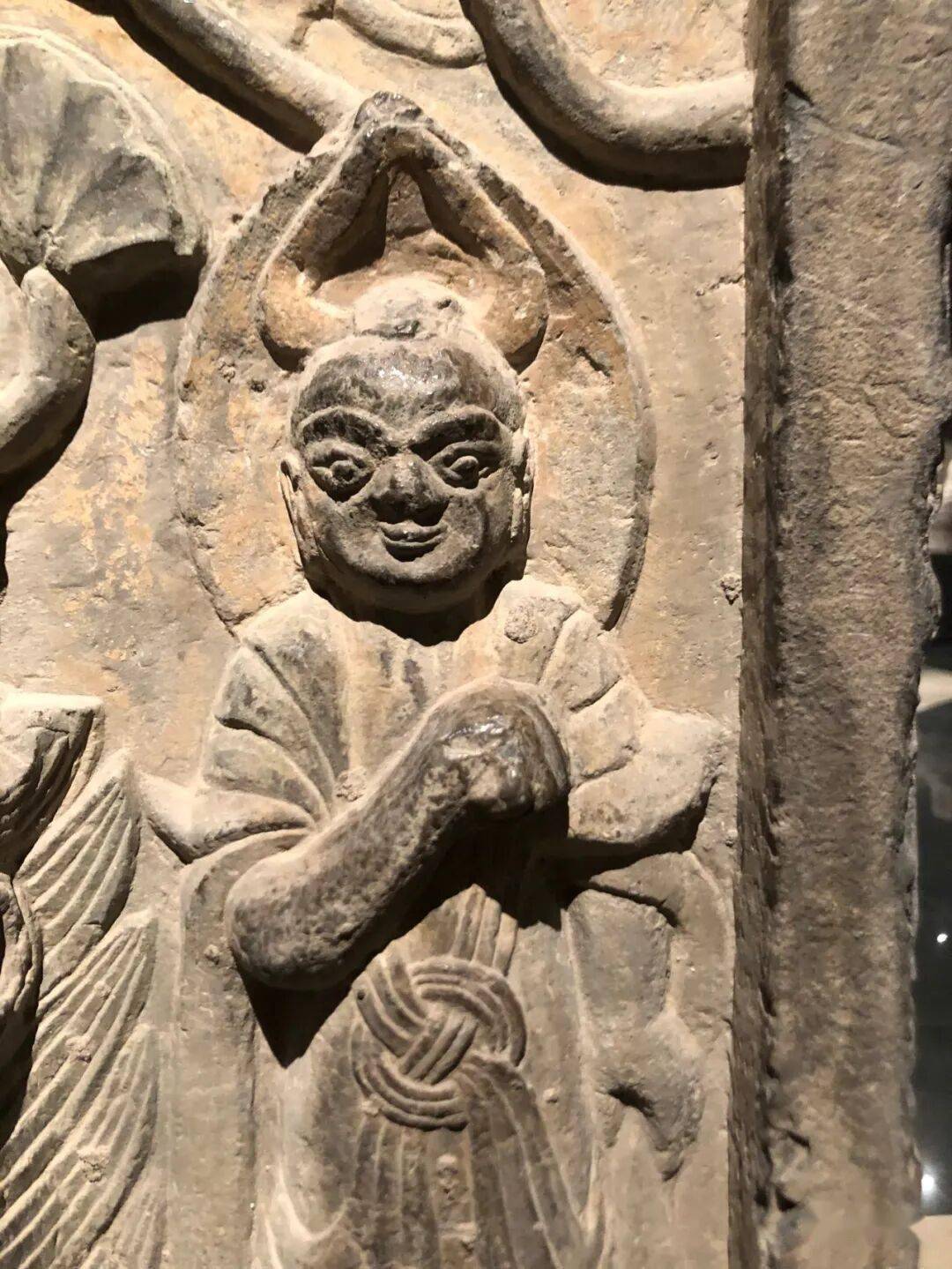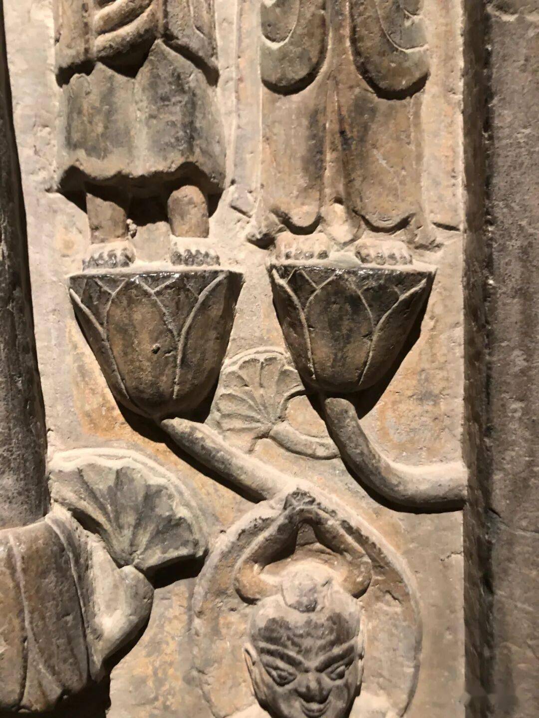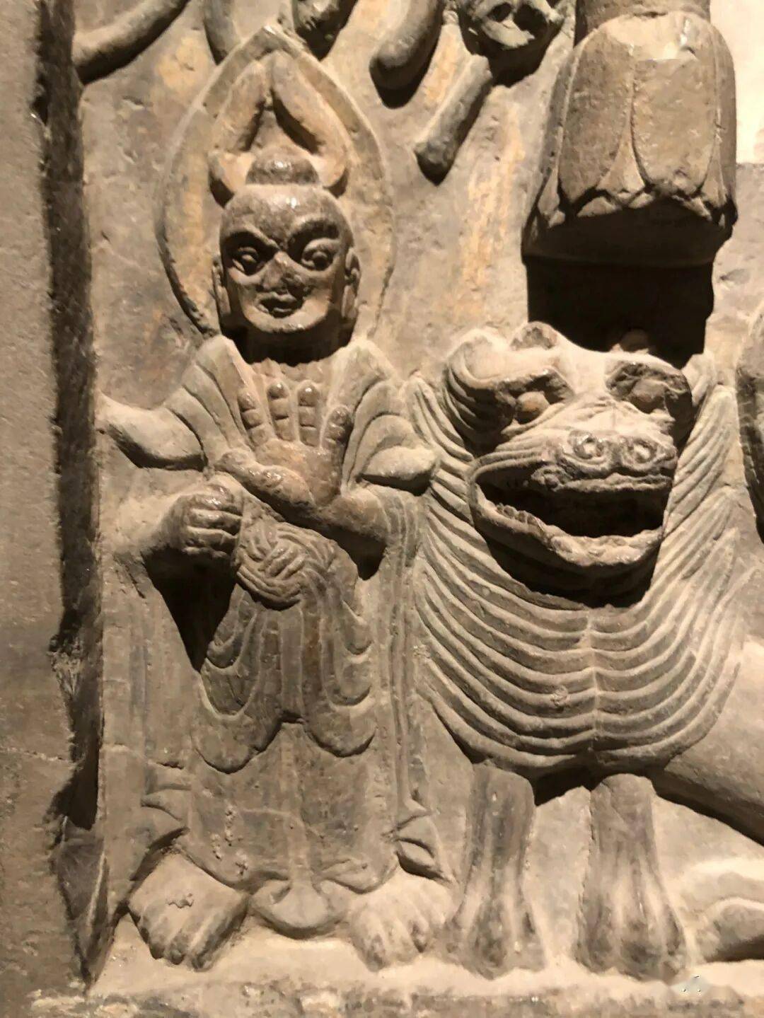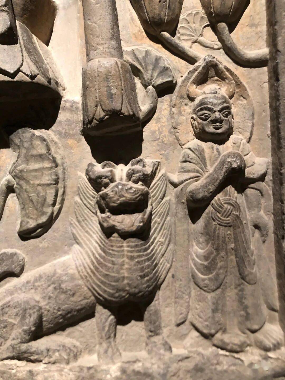 右侧菩萨右手握莲蕾屈肘于胸侧,左侧菩萨头部残,双手捧莲蕾于胸前。主尊座下雕一莲花化生双手托举博山炉,外雕二护法狮子和二力士。