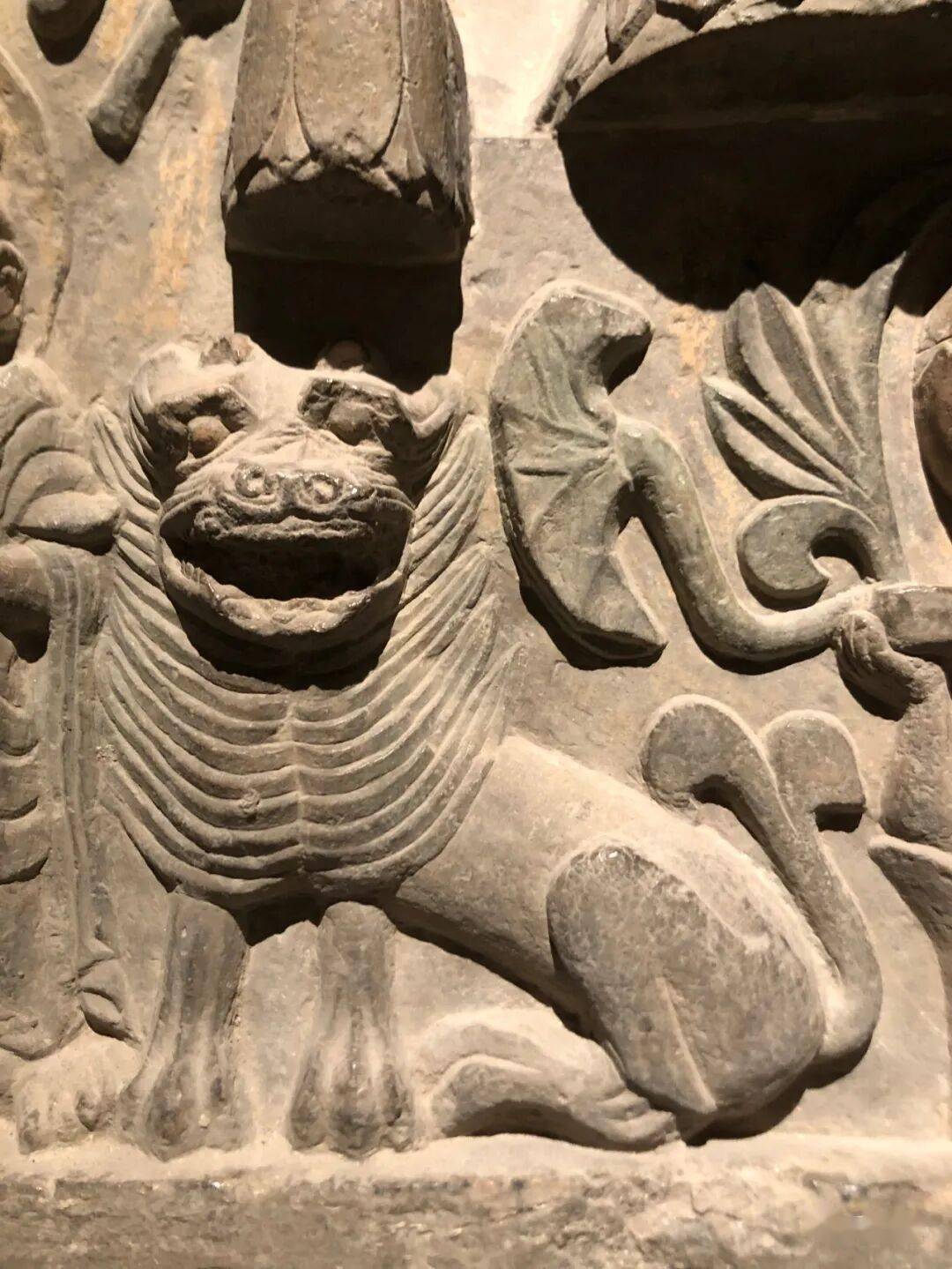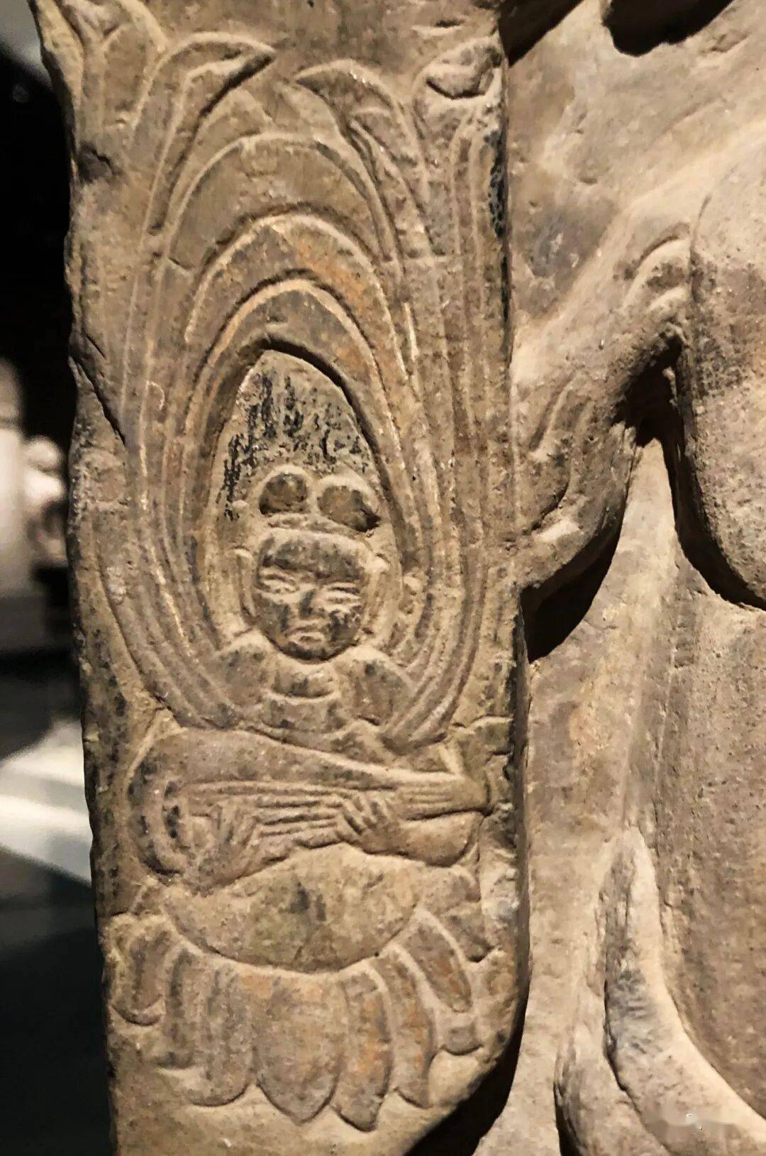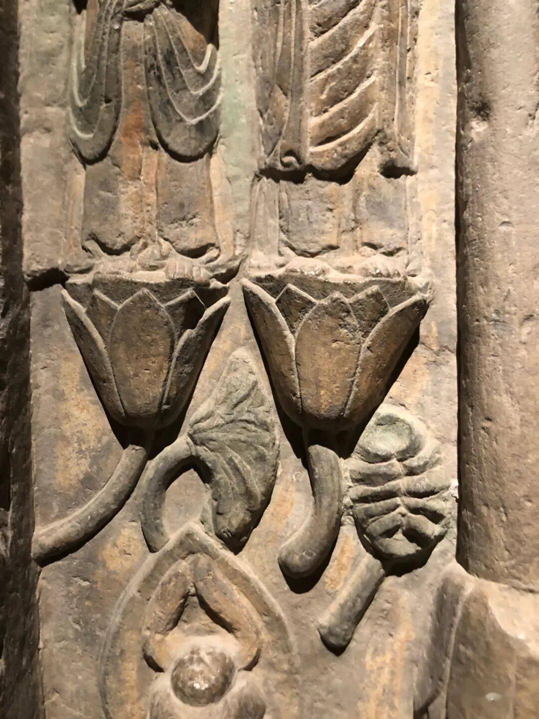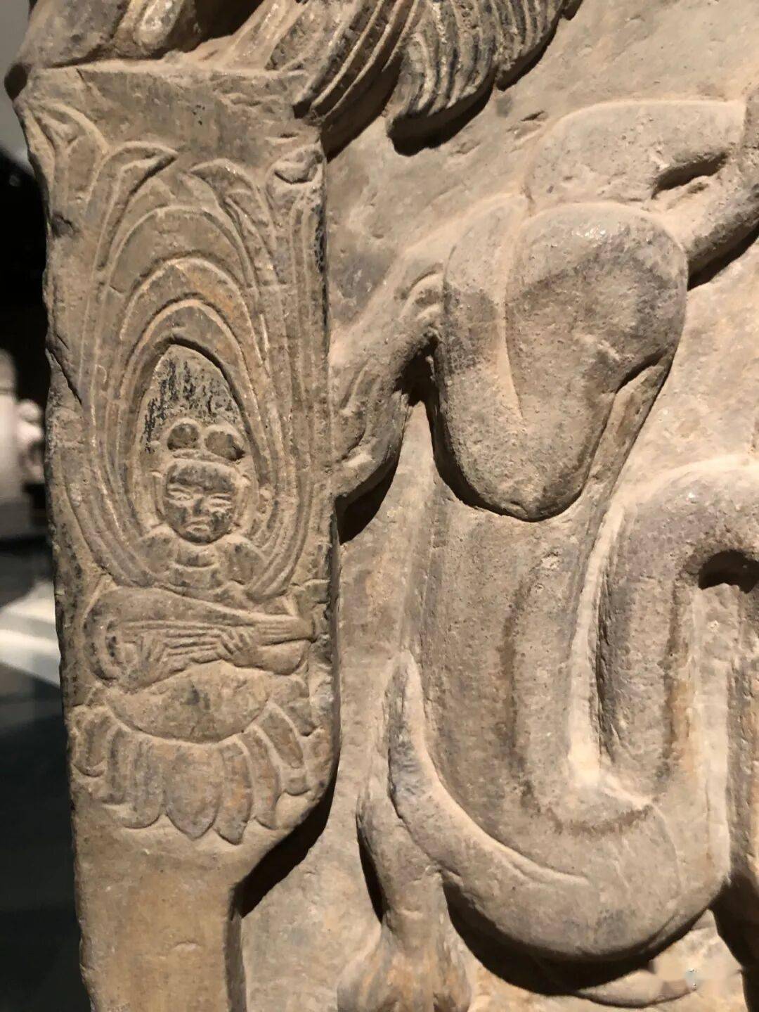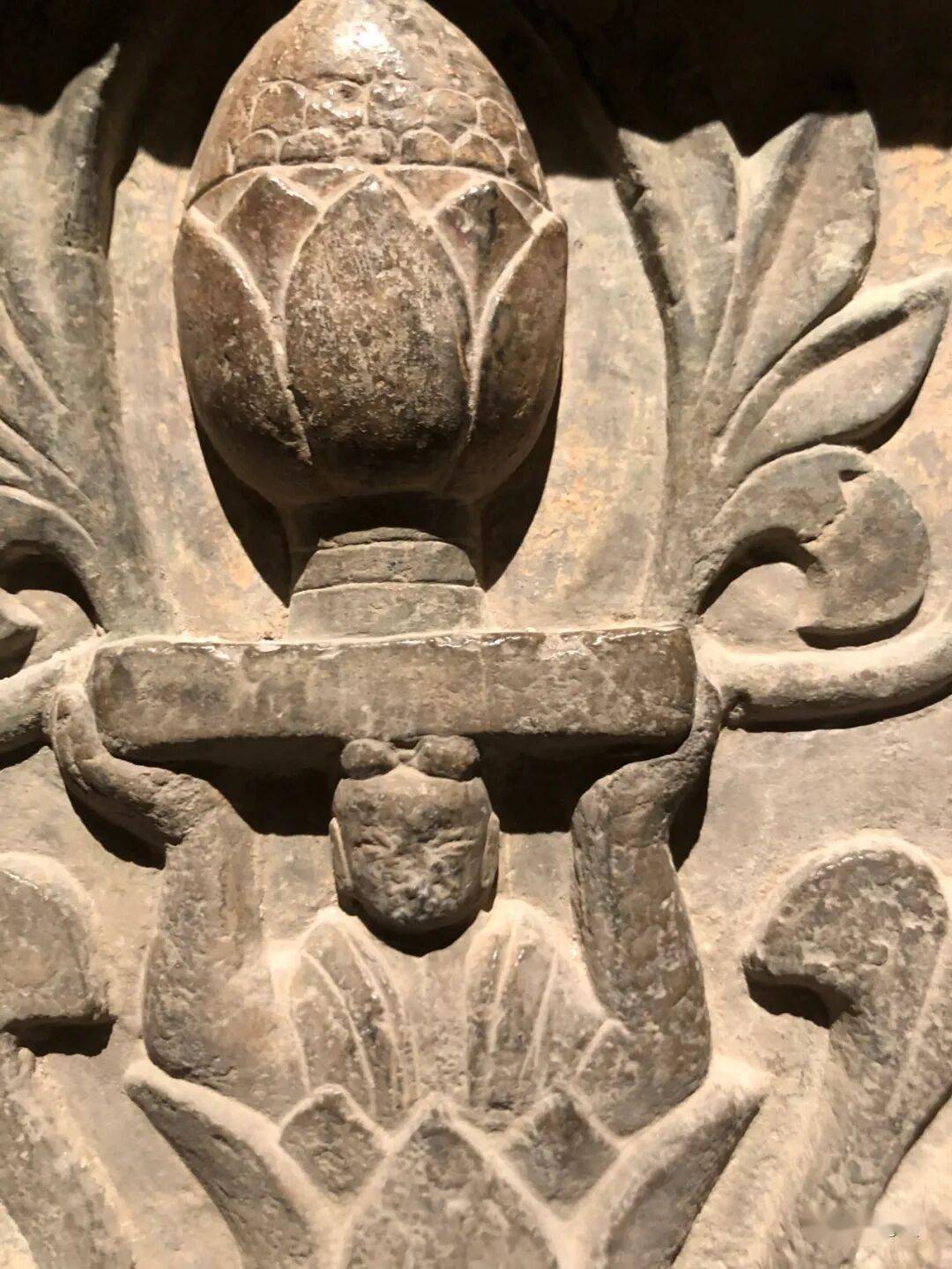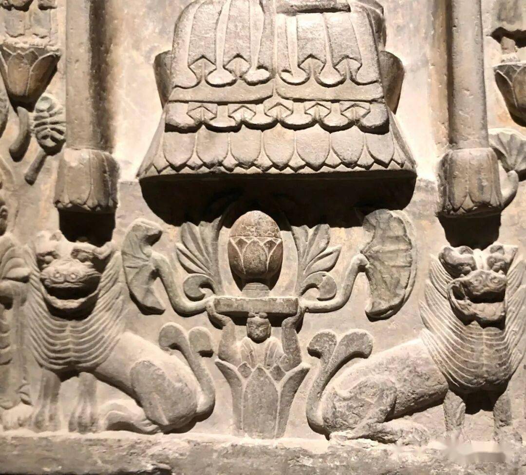 右侧菩萨右手握莲蕾屈肘于胸侧,左侧菩萨头部残,双手捧莲蕾于胸前。主尊座下雕一莲花化生双手托举博山炉,外雕二护法狮子和二力士。