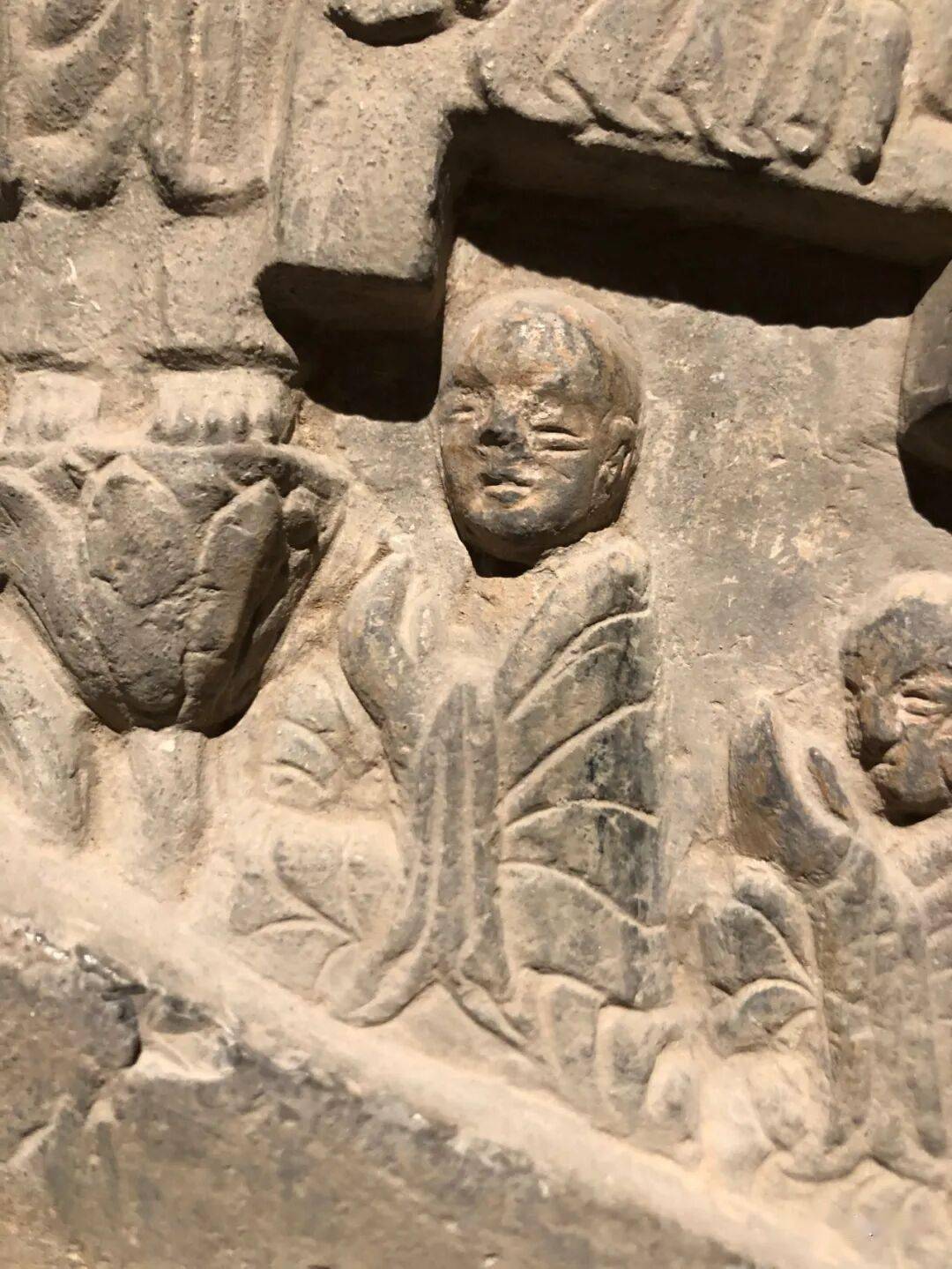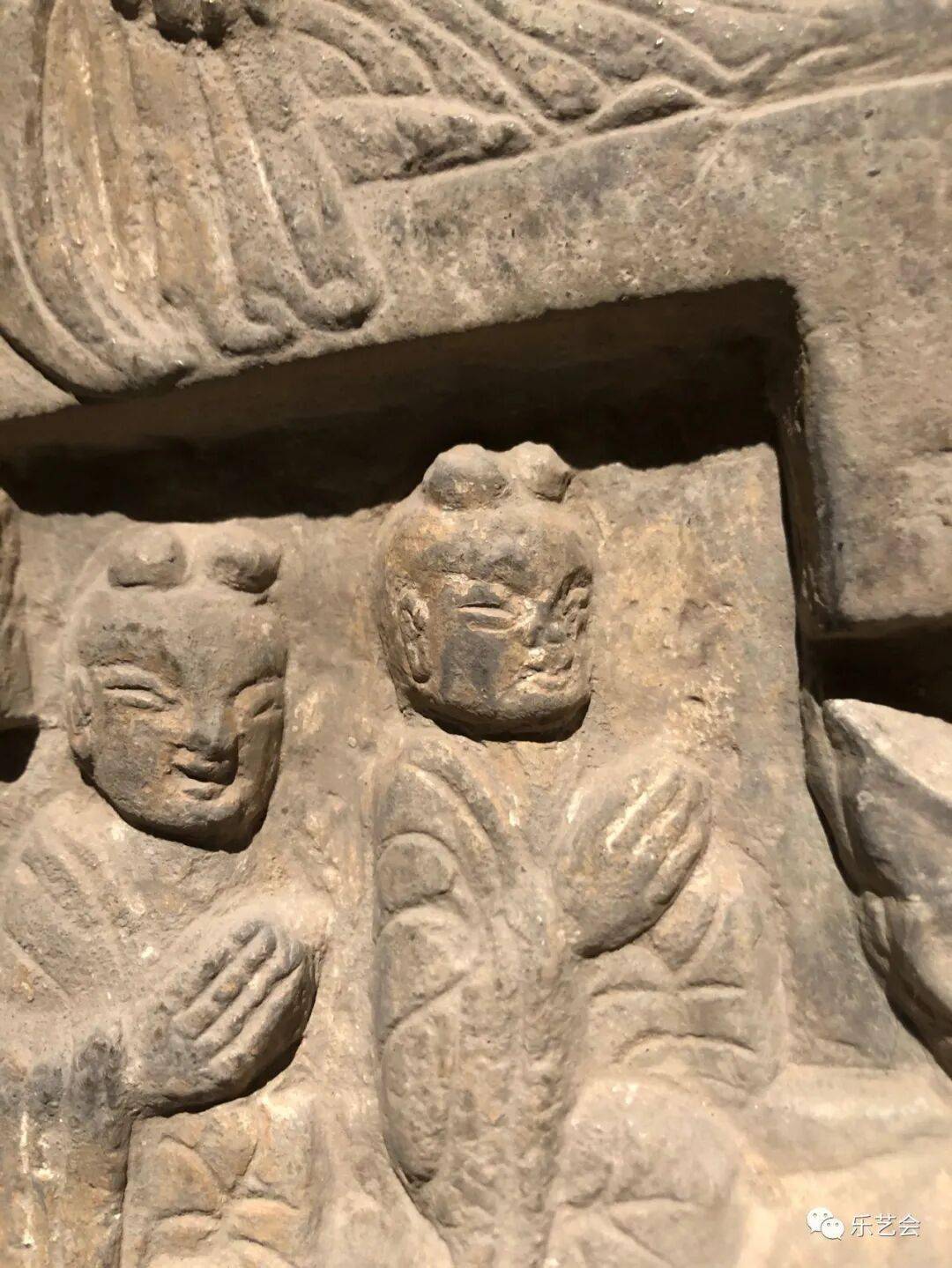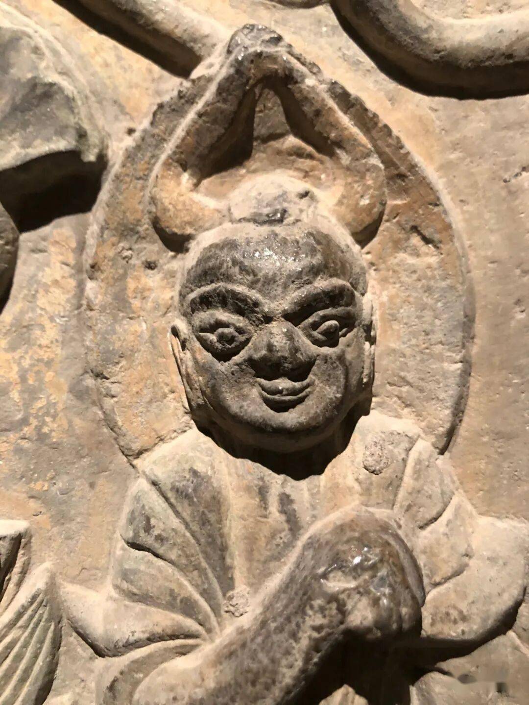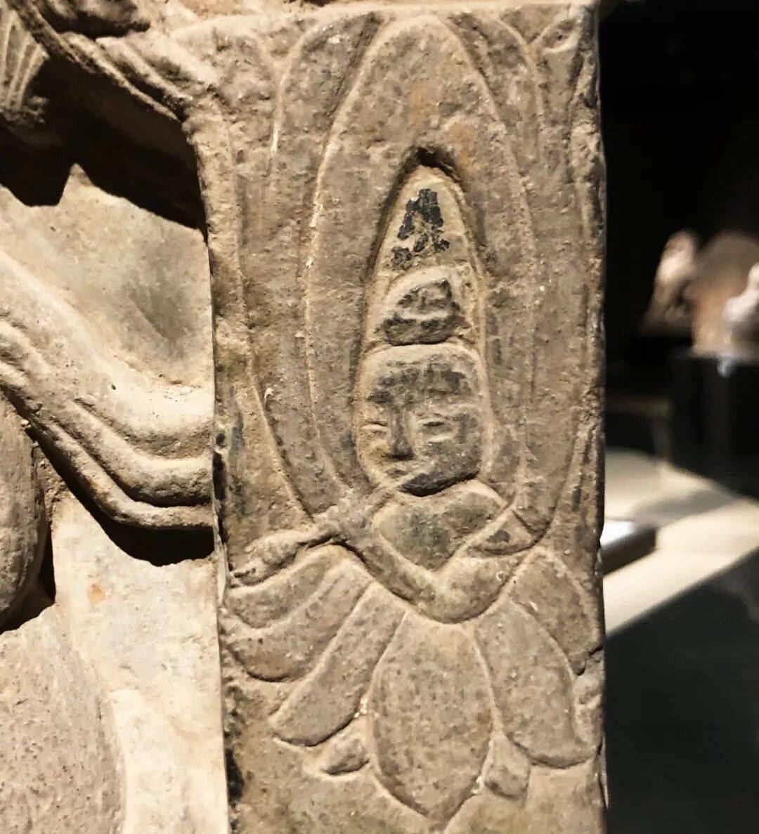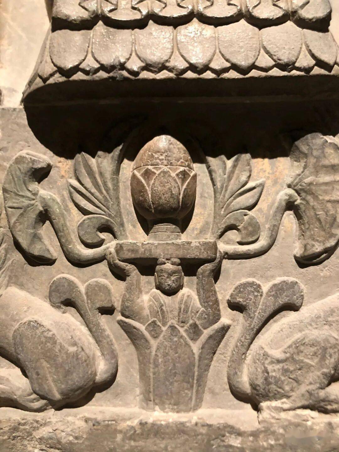 右侧菩萨右手握莲蕾屈肘于胸侧,左侧菩萨头部残,双手捧莲蕾于胸前。主尊座下雕一莲花化生双手托举博山炉,外雕二护法狮子和二力士。
