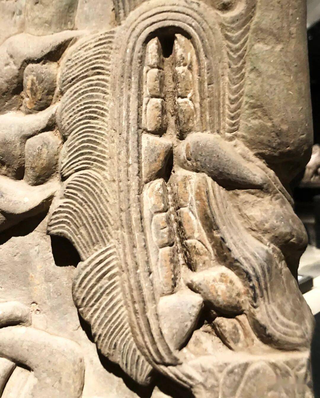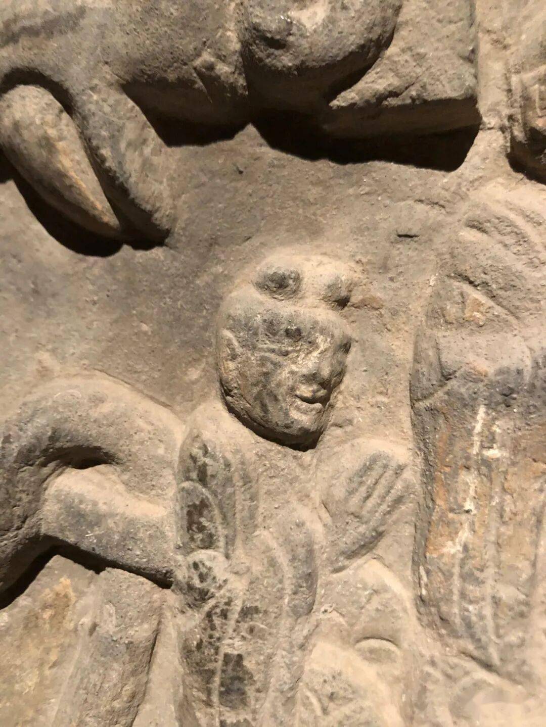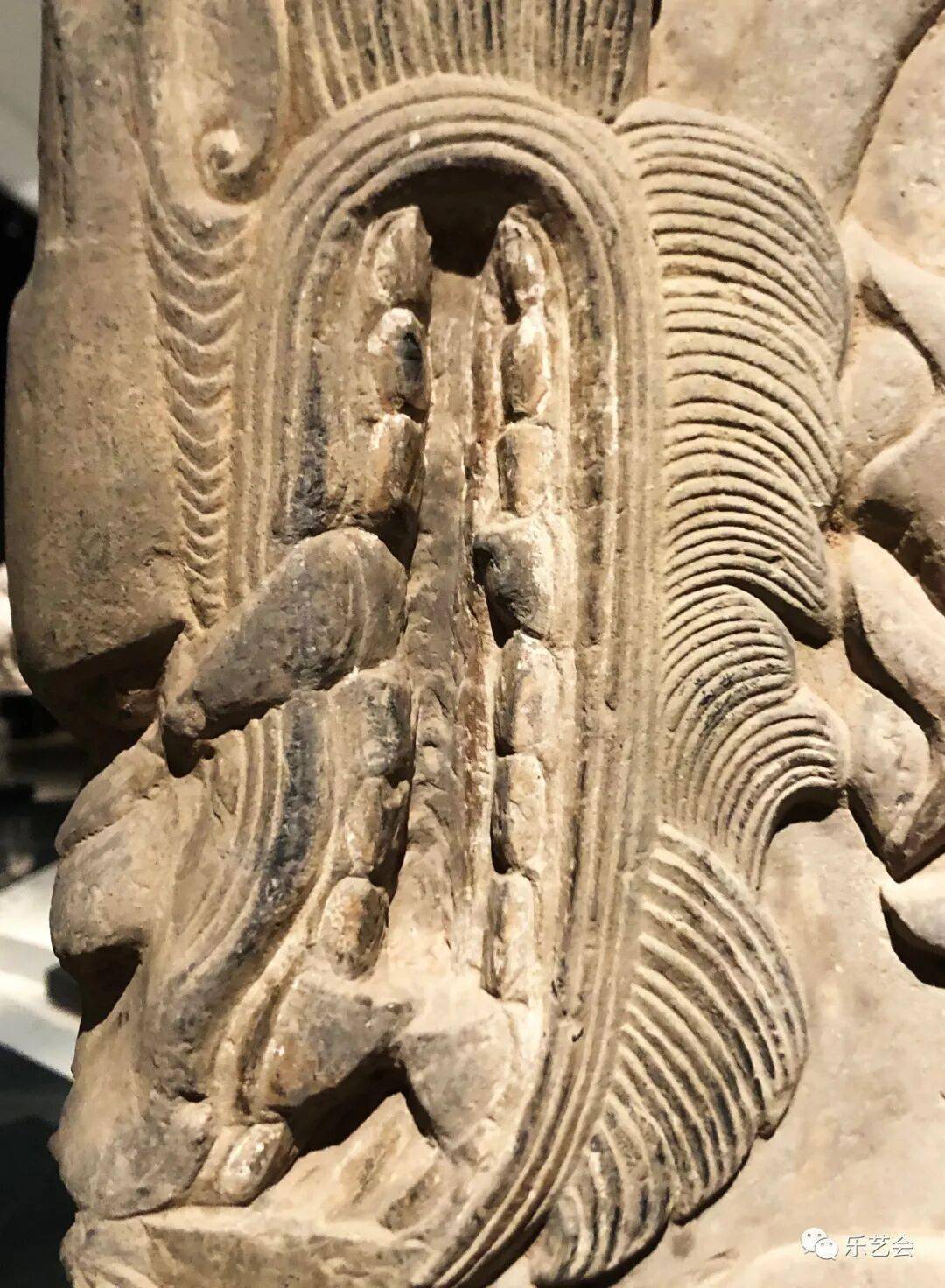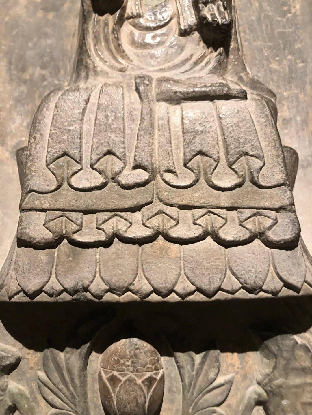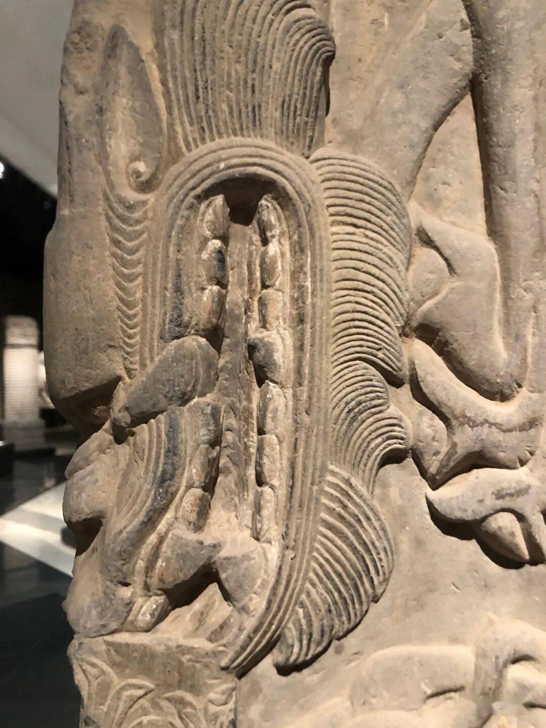 右侧菩萨右手握莲蕾屈肘于胸侧,左侧菩萨头部残,双手捧莲蕾于胸前。主尊座下雕一莲花化生双手托举博山炉,外雕二护法狮子和二力士。