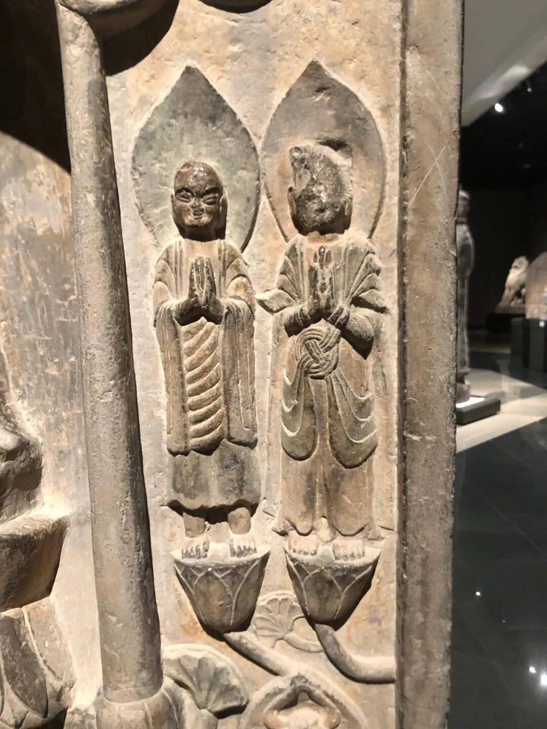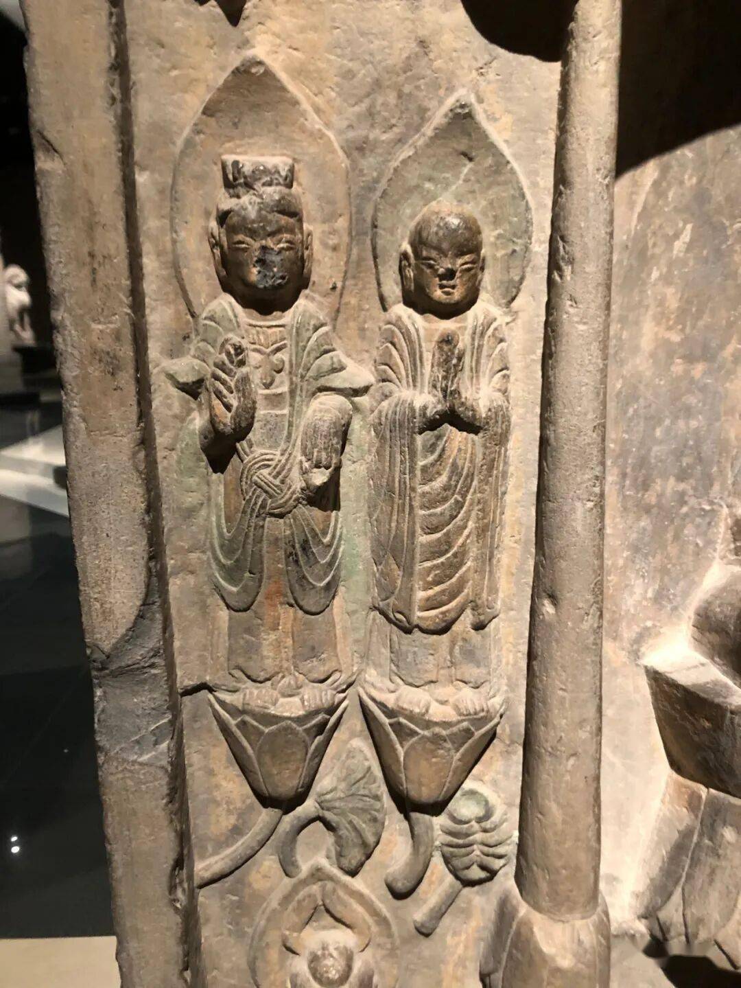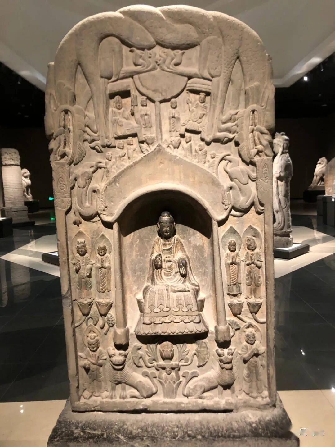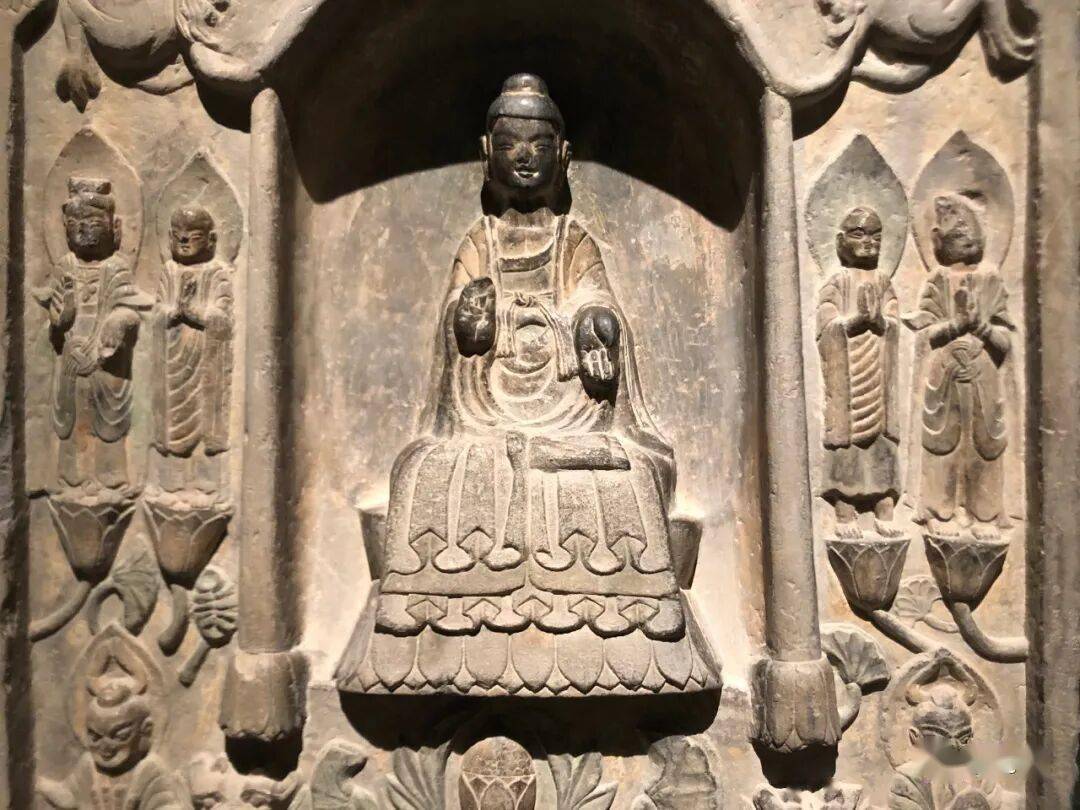碑额处雕“维摩经变”,二者间有两个弟子双手合十恭立于长梗莲座上。其下雕菩萨弟子各三人。