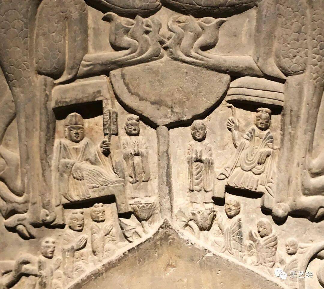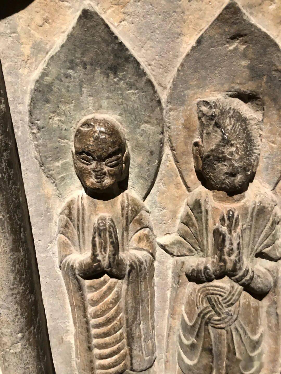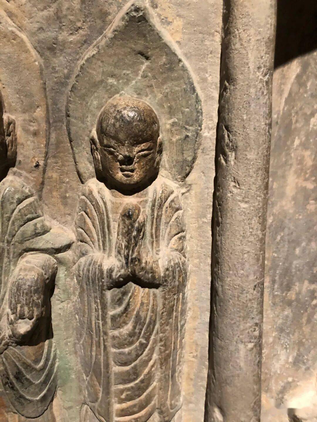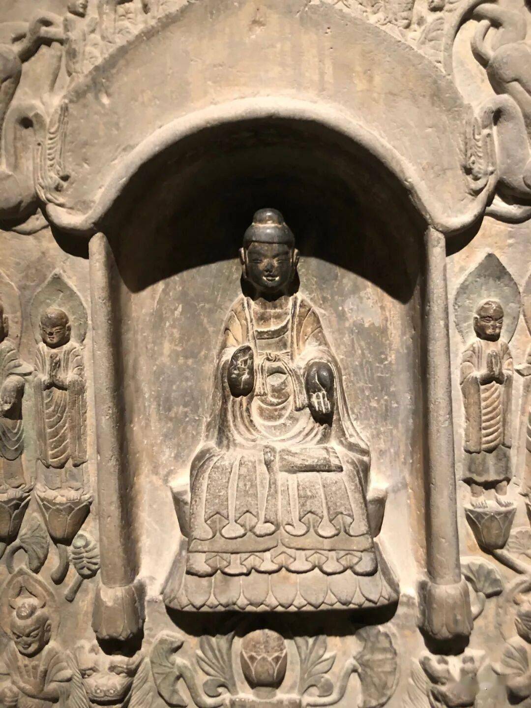 碑额处雕“维摩经变”,二者间有两个弟子双手合十恭立于长梗莲座上。其下雕菩萨弟子各三人。