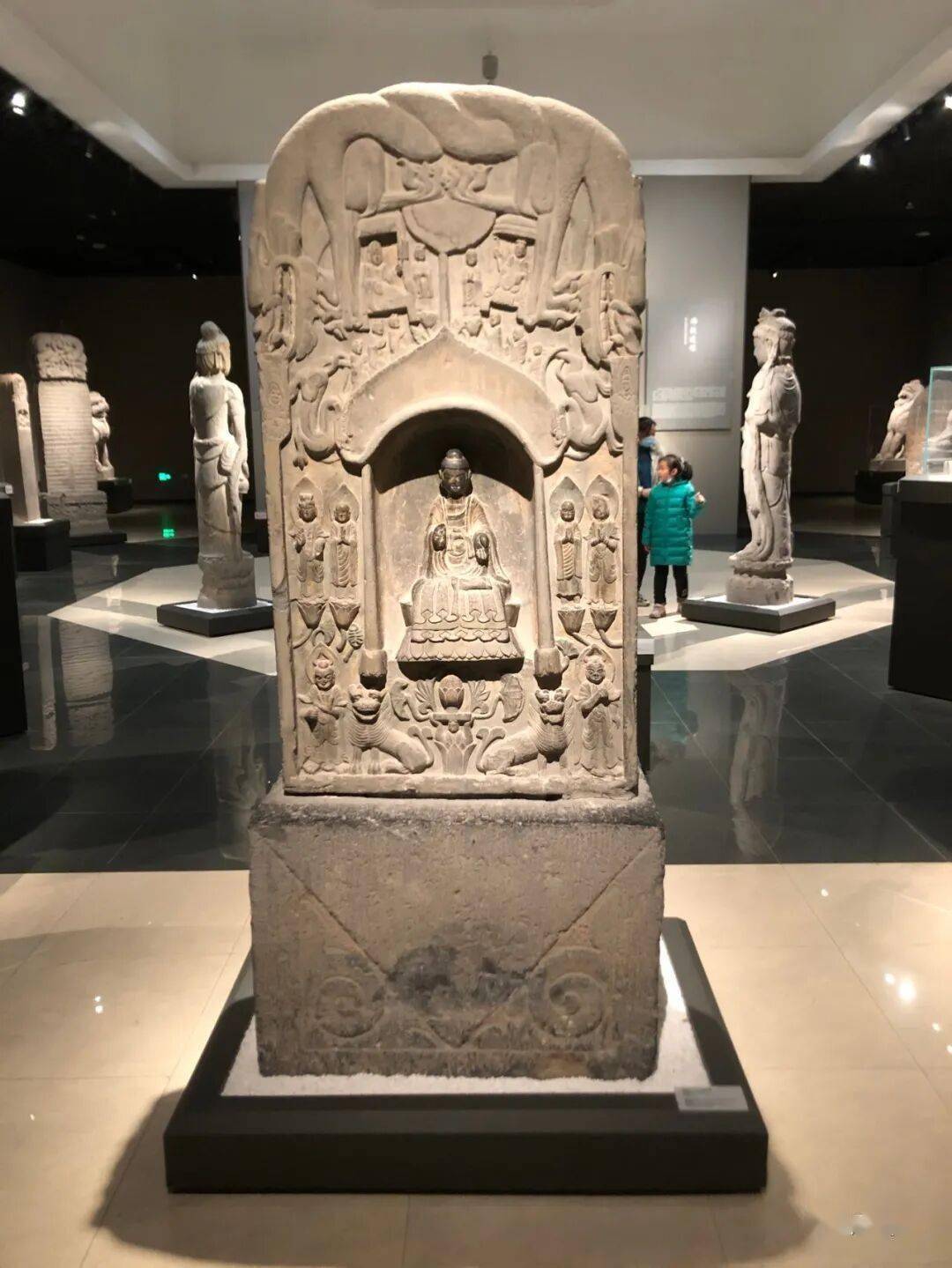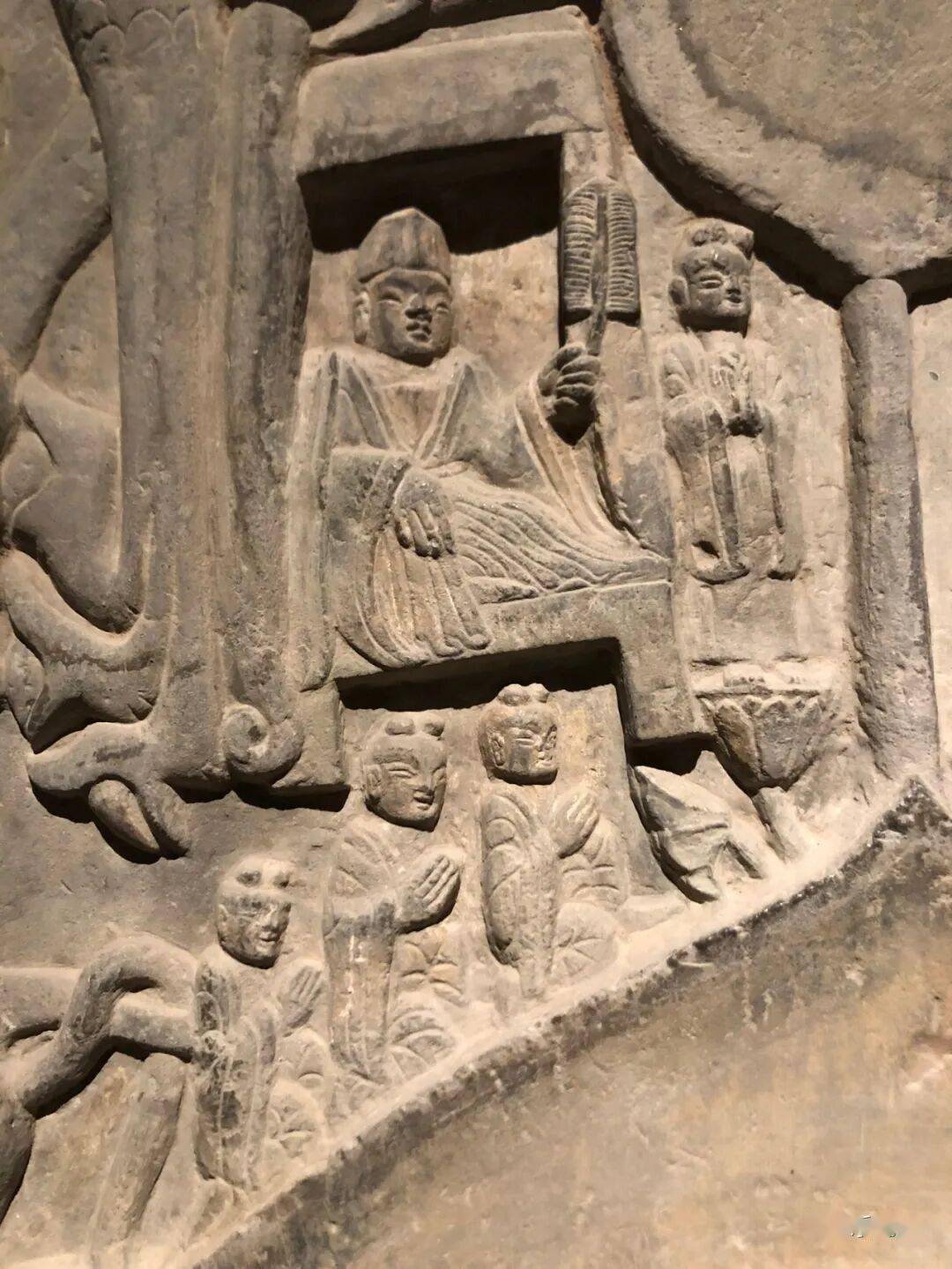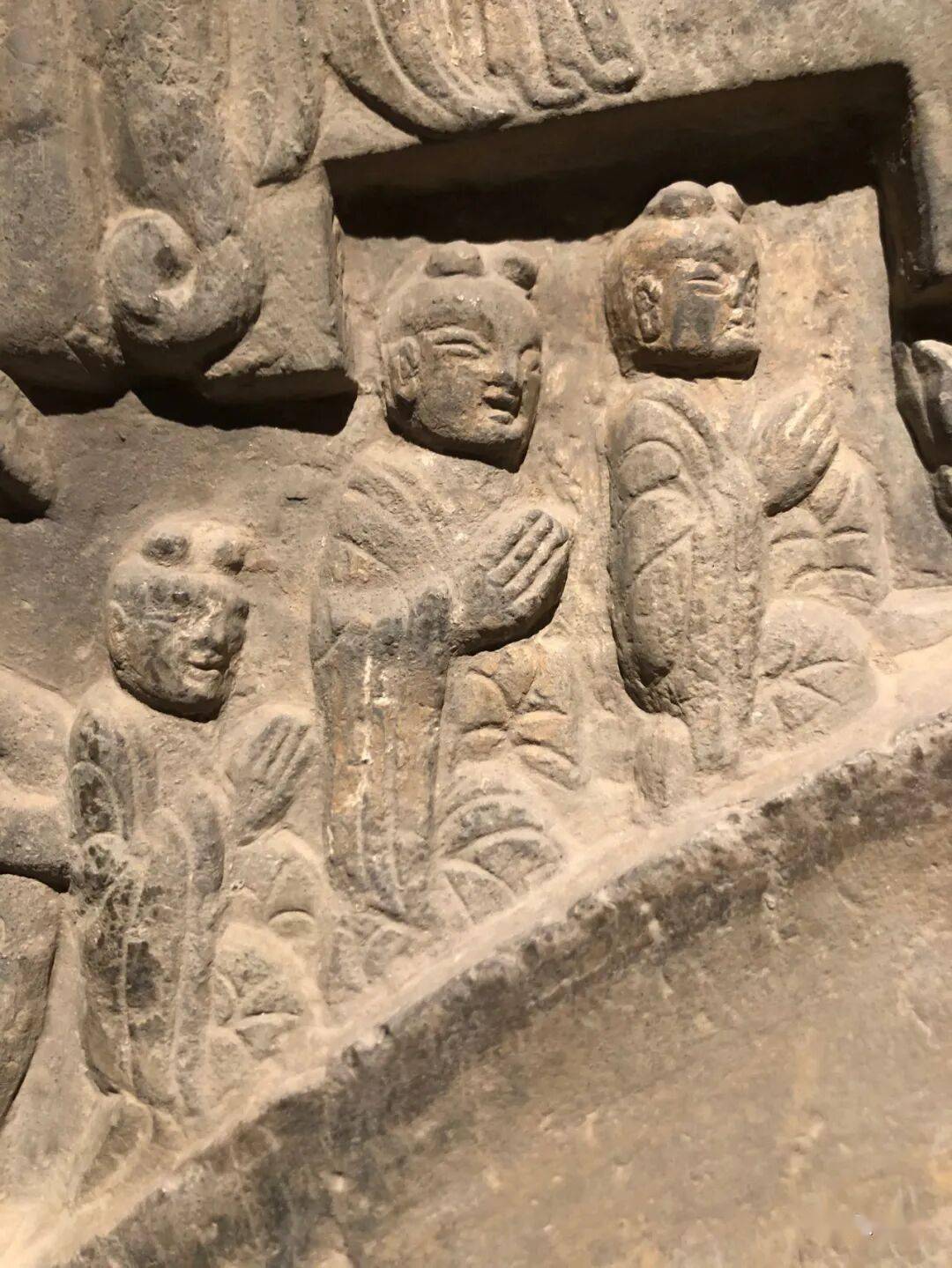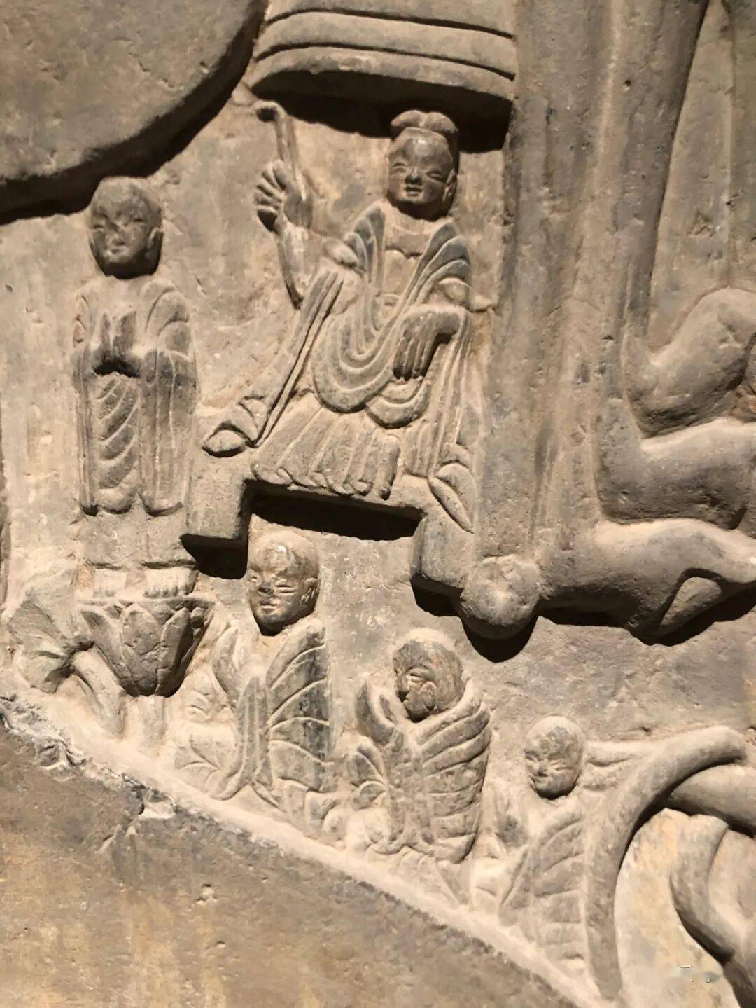 碑额处雕“维摩经变”,二者间有两个弟子双手合十恭立于长梗莲座上。其下雕菩萨弟子各三人。