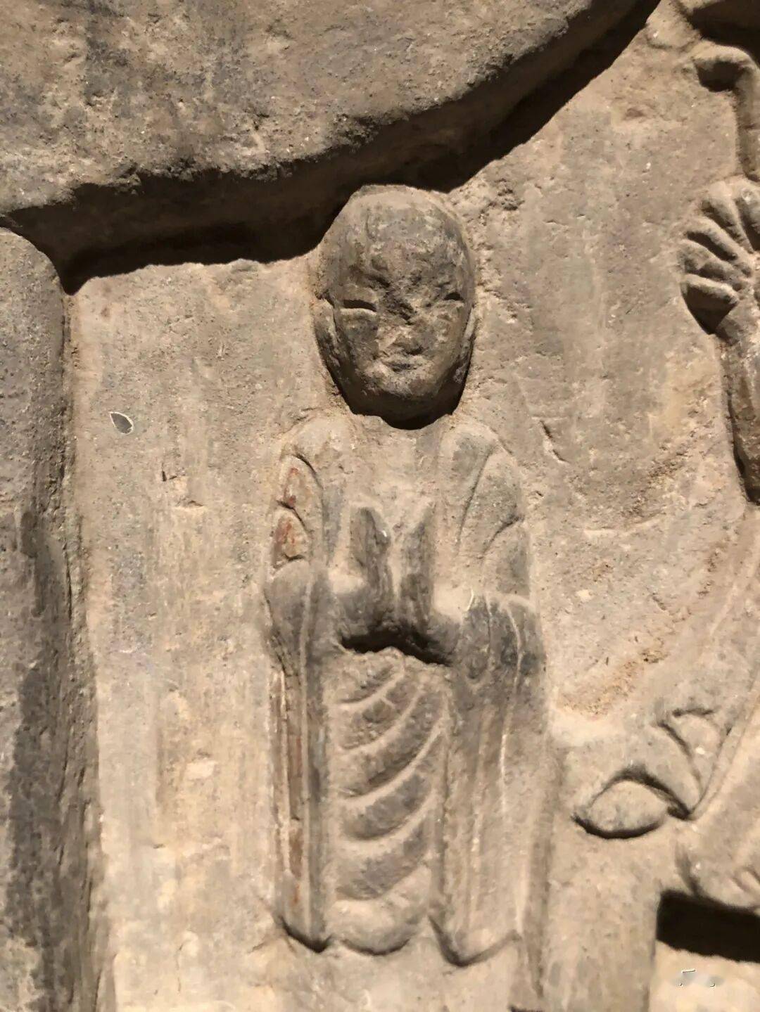 龛内雕一佛,着双领下垂袈裟,内着僧祗支,手施无畏与愿印,结跏趺坐于束腰仰覆莲座上.,龛柱外雕二弟子二菩萨,跣足立于长梗莲座上。弟子两手合十胸前。菩萨头戴花冠。