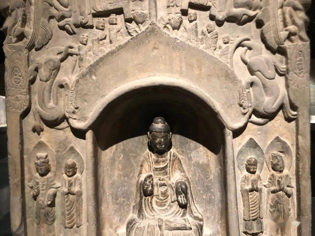 碑首为弧形,雕六龙盘绕,龙首向下口衔碑身两侧。碑阳:碑额与碑身雕刻连为一体。碑身雕一尖楣圆拱形大龛,龛柱下饰莲瓣形柱础,龛楣两侧各雕一龙口衔上卷的龛梁两端。龙外侧各线刻一伎乐天人,下饰莲花,左侧天人手握竖笛,右侧天人手持琵琶作正面飞翔状。