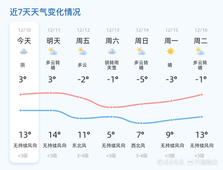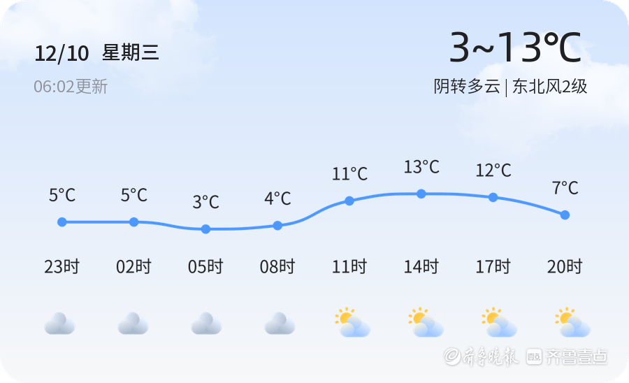 今天是12月10日,星期三,农历十月廿一。枣庄市天气阴转多云,气温在3℃到13℃之间,东北风2级,空气湿度为70%,PM2.5指数为81,空气质量良好。各区天气情况基本一致,整体以阴转多云为主,风力较小,适合市民外出活动。