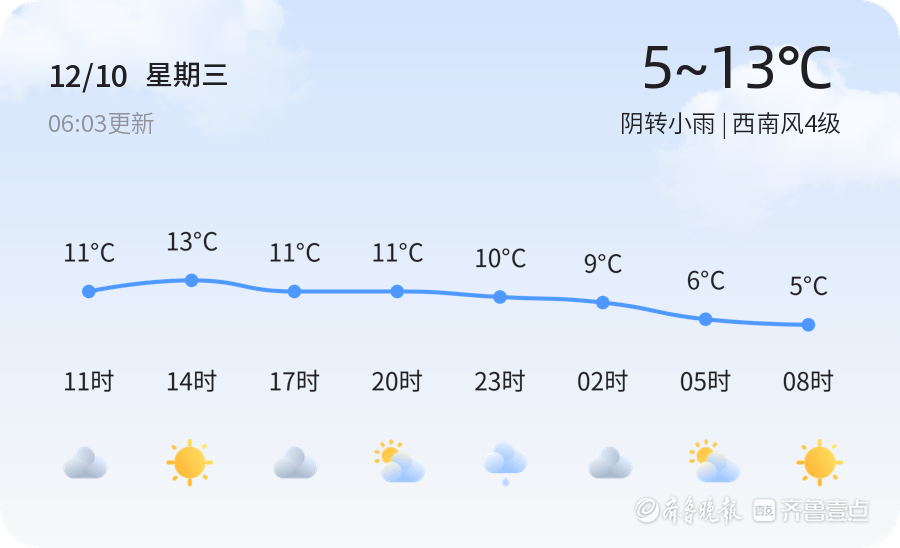 今天是12月10日,星期三,农历十月廿一。烟台市今天天气阴转小雨,气温介于5℃到13℃之间,西南风4级,湿度67%,PM2.5指数71。各区天气情况基本一致,阴雨天气为主,风力较大,市民出行需携带雨具,注意防风保暖。