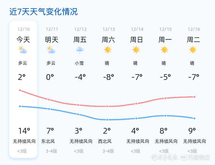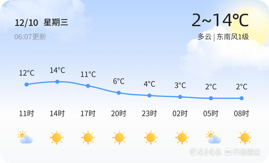 未来三天,滨州气温较低,市民需做好防寒保暖工作,特别是早晚温差较大,建议增添衣物。12月12日有小雪天气,司机朋友请注意减速慢行,防范道路湿滑带来的安全隐患。其余时段天气晴好,适合户外活动。