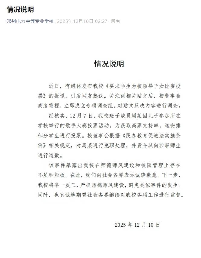新京报讯 12月10日,郑州电力中等专业学校微信公众号发布情况说明。