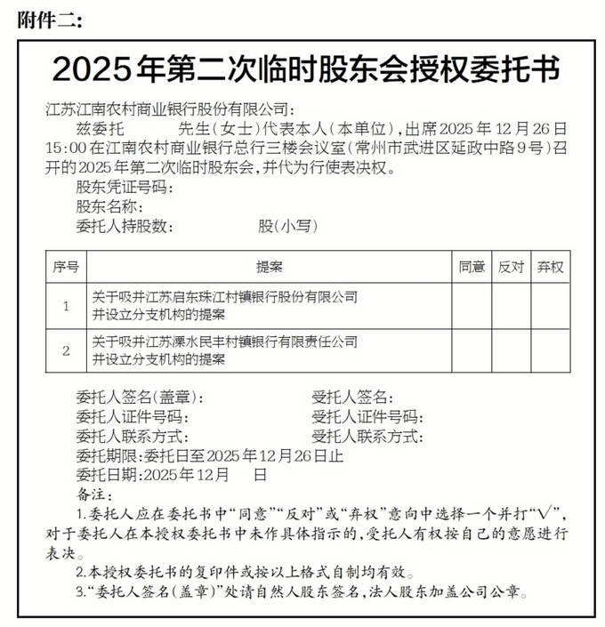 根据《中华人民共和国公司法》和《江苏江南农村商业银行股份有限公司章程》等规定,经江苏江南农村商业银行股份有限公司(以下简称“本行”)第五届董事会第二十二次(临时)会议表决通过,决定于2025年12月26日召开本行2025年第二次临时股东会。现将有关事项通知如下: