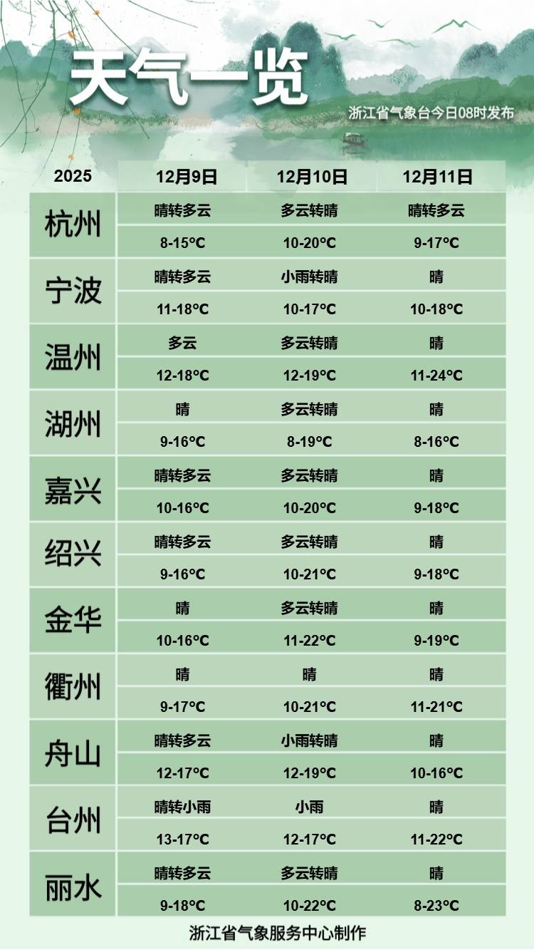 今天:浙南和沿海地区多云;其它地区晴到少云。
