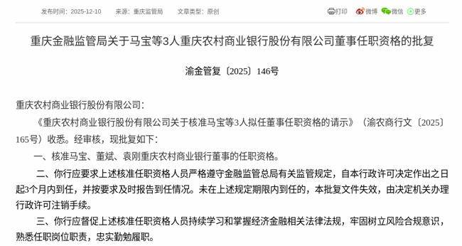 2025年12月10日,根据国家金融监督管理总局消息,《重庆农村商业银行股份有限公司关于核准马宝等3人拟任董事任职资格的请示》获得通过,批复马宝、董斌、袁刚重庆农村商业银行股份有限公司董事的任职资格。