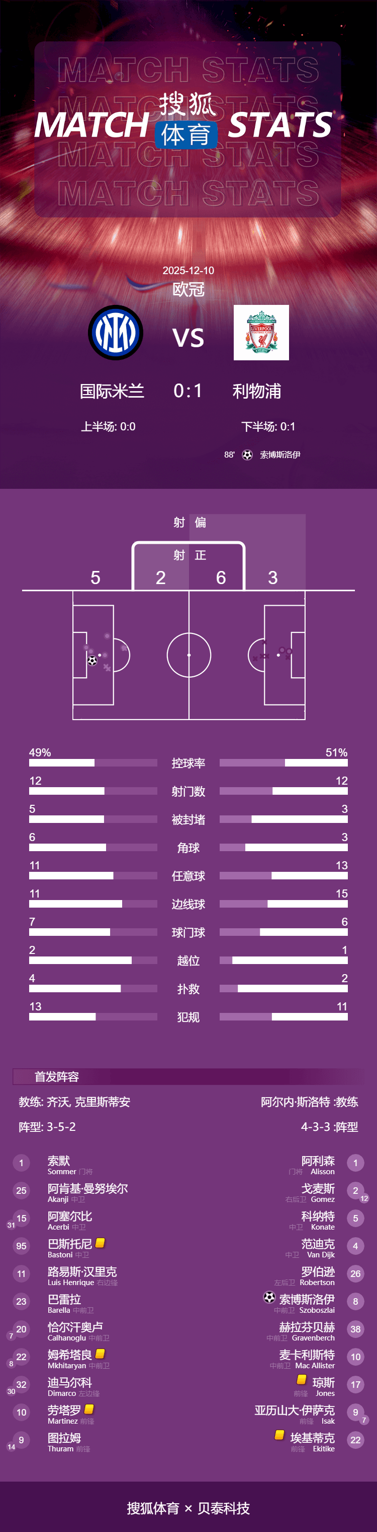 北京时间12月10日凌晨4时,2025-26赛季欧冠联赛第6轮展开角逐,利物浦做客意大利梅阿查球场1-0获胜,送国际米兰欧冠赛事两连败,同时终结该队欧冠主场18场不败纪录。全场唯一进球出现在第88分钟,索博斯洛伊罚进维尔茨制造的点球一剑封喉。此外,科纳特有一个进球因队友埃基蒂克手球被吹。