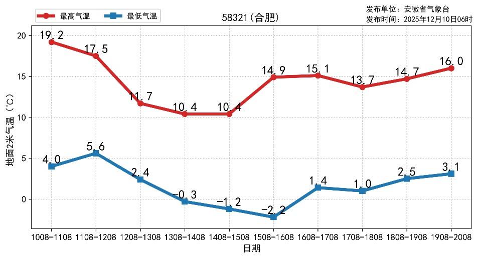 合肥今日最高气温19℃,13日将降至10℃;亳州今日最高气温16℃,12日将降至5℃,累计降幅都在10℃左右。