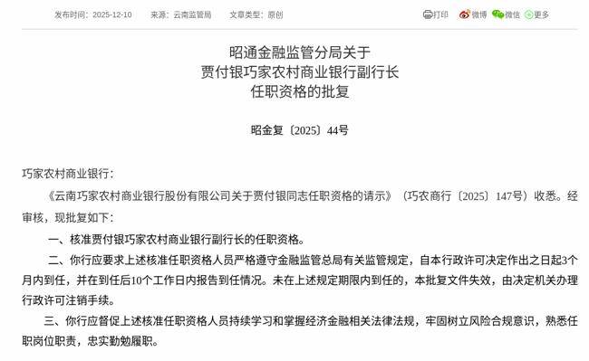 2025年12月10日,根据国家金融监督管理总局消息,《云南巧家农村商业银行股份有限公司关于贾付银同志任职资格的请示》获得通过,批复贾付银云南巧家农村商业银行股份有限公司副行长的任职资格。