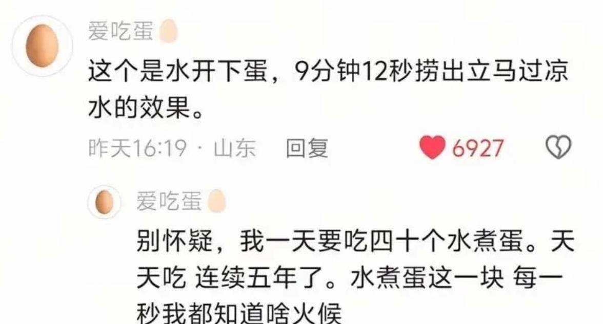 日前,一位网友在社交平台分享了一枚拥有“小行星”一般纹路的完美水煮蛋,博主“爱吃蛋”则在该视频下留下了煮出这样鸡蛋所需的时间,精准到秒。面对网友质疑,他回复道“别怀疑,我一天要吃四十个水煮蛋。天天吃,连续五年了。水煮蛋这一块,每一秒我都知道啥火候。”