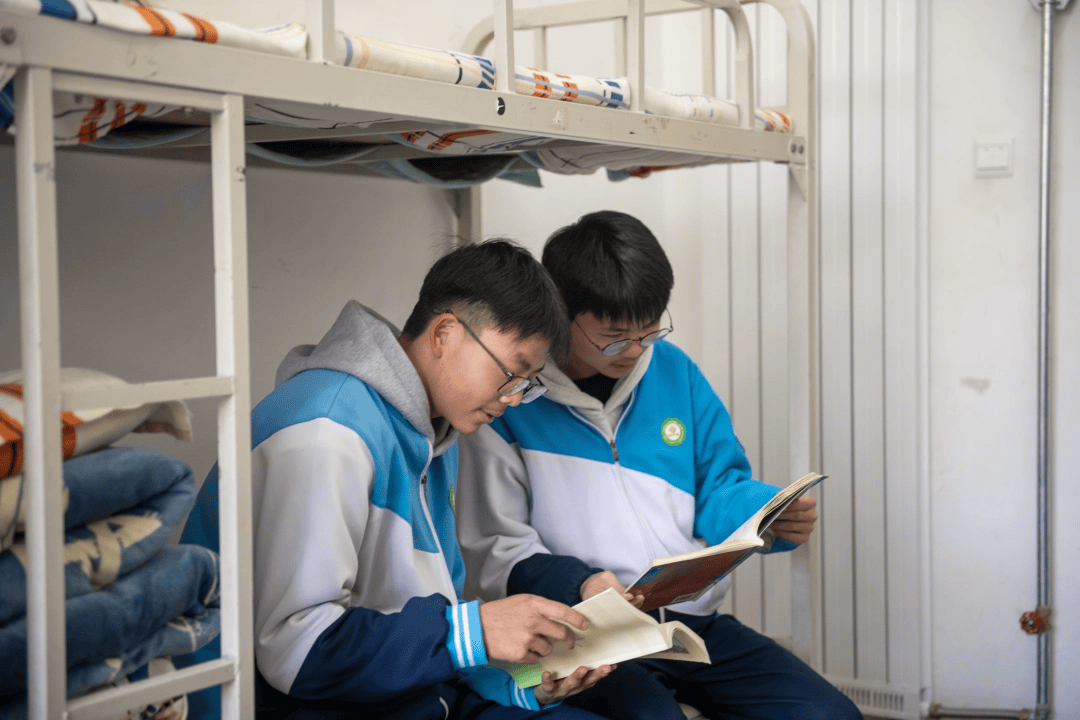 玉舍镇第二中学学生在温暖的宿舍内看书。