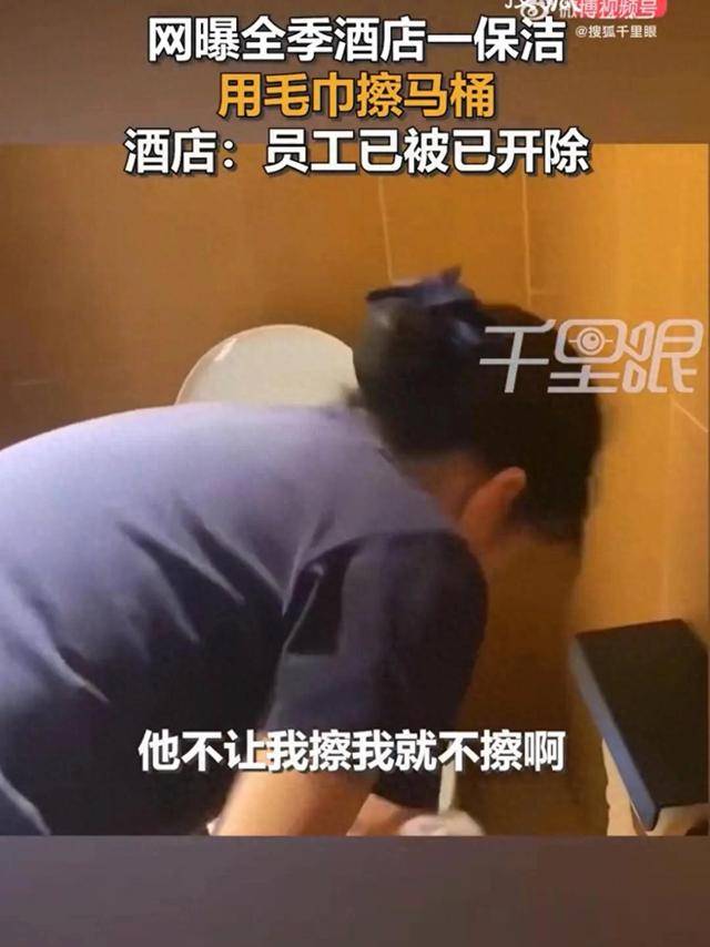 12月6日,江苏无锡。网曝全季酒店无锡梅里古镇锡贤路店一保洁用毛巾擦马桶,疑似同事在一旁问怎么用这毛巾擦马桶,该保洁回应:“我什么毛巾都擦,他不让我擦我就不擦啊。”12月7日,该酒店工作人员回应称这名保洁已被开除,这么做确实恶心,以后会严加管理。(搜狐千里眼)