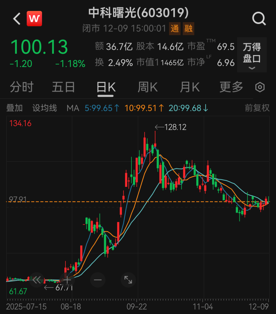 12月9日,中科曙光股价以100.13元/股报收,最新市值为1465亿元;海光信息股价以219.3元/股报收,最新市值为5097亿元。