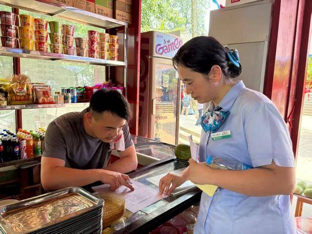 农行都江堰市支行工作人员正在向景区商户介绍金融产品