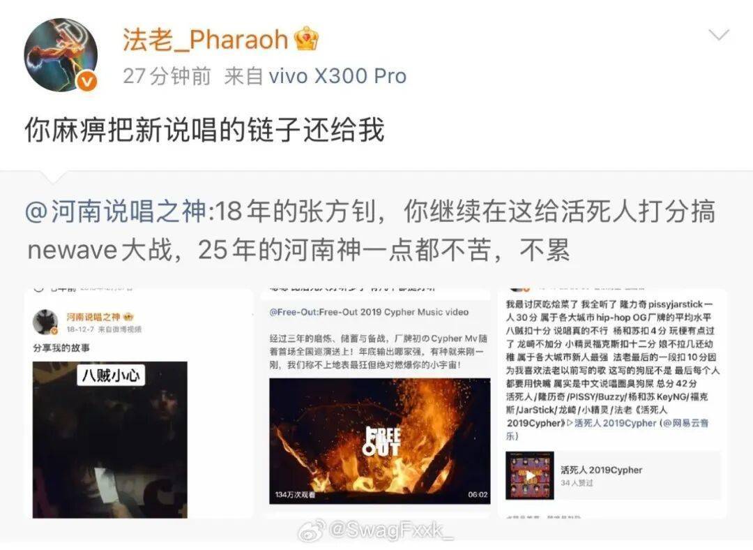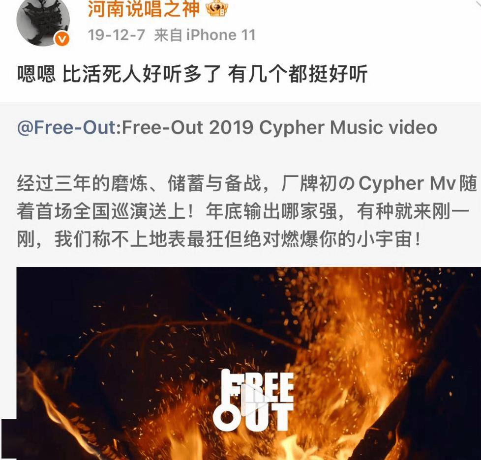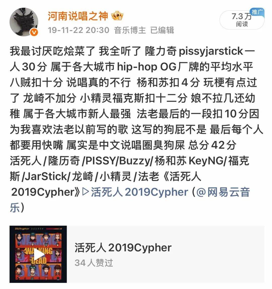 就在今天下午,河南说唱之神突然晒出自己曾经对活死人2019cypher的锐评:“属实是中文说唱圈臭狗屎”: