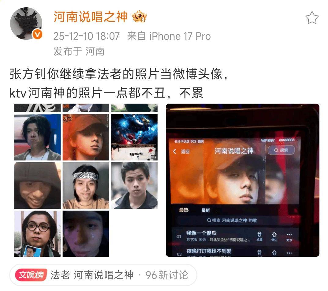 “张方钊你继续拿法老的照片当微博头像,ktv河南神的照片一点都不丑,不累”