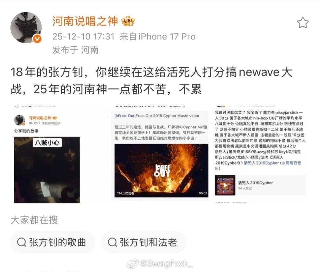 “18年的张方钊,你继续在这给活死人打分搞newave大战,25年的河南神一点都不苦,不累”