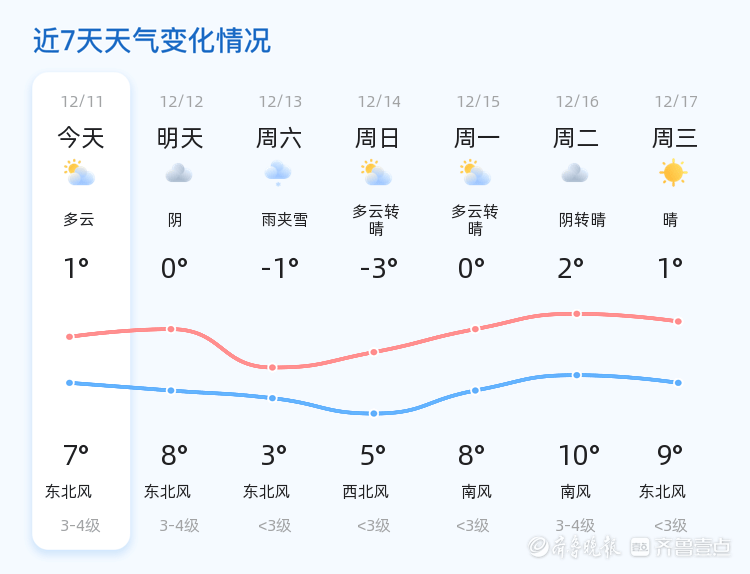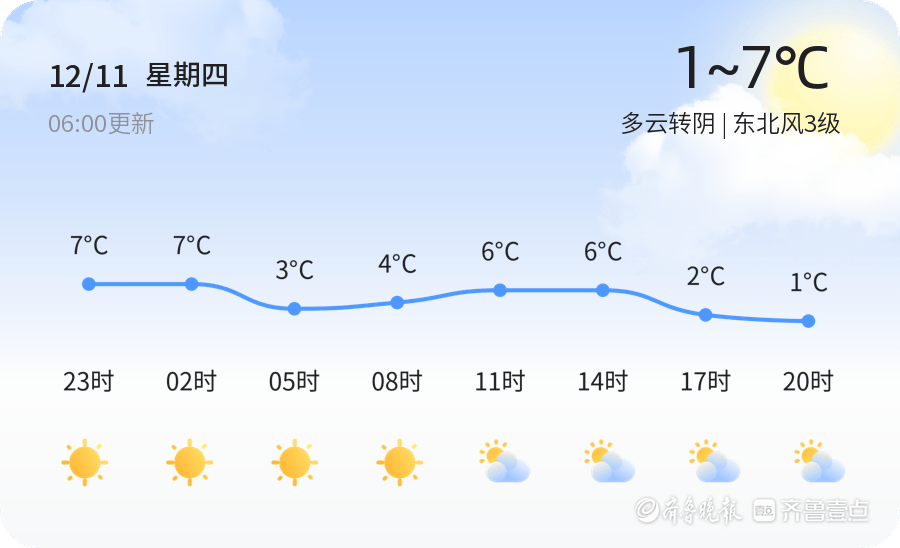 今天是12月11日,星期四,农历十月廿二。济南今日天气多云转阴,气温在1℃到7℃之间,东北风3级,空气湿度82%,PM2.5指数为152。各区天气情况基本一致,市民朋友们请注意保暖。