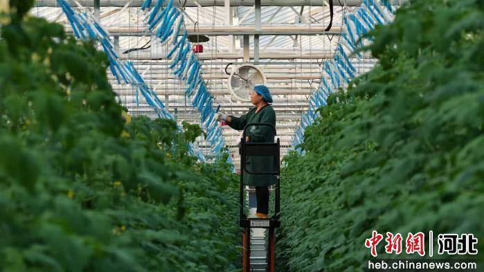 中新网河北新闻12月10日电 (王天译 柏瑞楠)10日,河北省邯郸市大名县智慧农业科技产业园樱桃番茄种植基地内,工作人员正在对樱桃番茄进行落蔓处理。