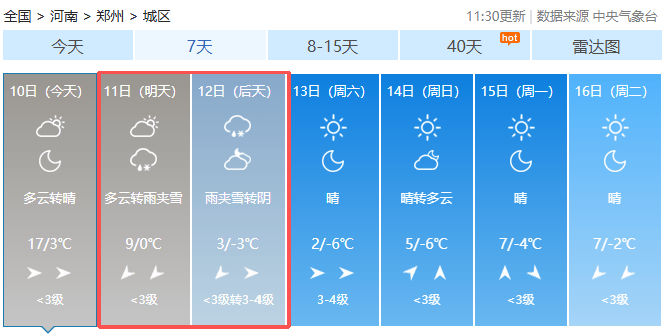 全省天气预报 (河南省气象台2025年12月10日12时预报) 11日白天,全省晴天转多云。 11日夜里,全省多云转阴天,中西部、北部小雨或雨夹雪转小雪,局部有冻雨或冰粒;其他县(市、区)有小雨或零星小雨。 12日,全省阴天,中西部、北部有大雪,局部暴雪;东南部小雨或雨夹雪;其他县(市、区)雨夹雪转小到中雪,局部大到暴雪。 13日,全省多云转晴天。 受冷空气影响,今天到12日白天,全省偏北风4级左右,阵风6到7级,西部、西北部局部8到9级。12日夜里到13日白天,全省西北风4级左右,大部阵风7到8级,西部、西北部局部10级左右。13日,全省大部气温较前期下降8到10℃,局部可达12℃以上。 省会郑州 今天,多云转阴天,夜里有小雨或雨夹雪,东北风3到4级,阵风6到7级。 12日,阴天,雨夹雪转中到大雪,局部暴雪,东北风转西北风3到4级,阵风6到7级。 13日,晴天间多云,偏西风3到4级,阵风6到7级。 |