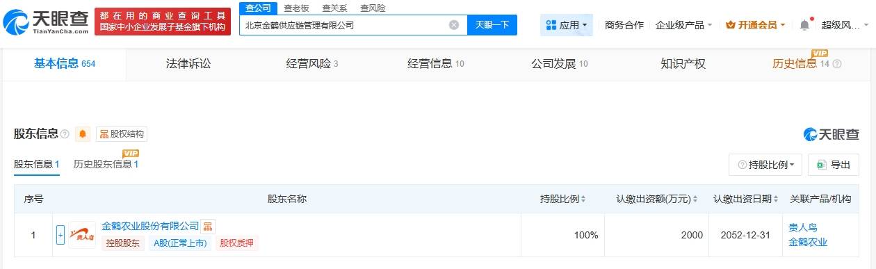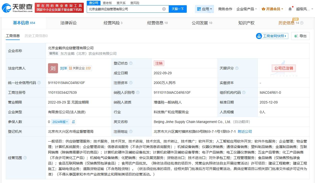 该公司成立于2022年9月,法定代表人为刘洋,注册资本2000万人民币,经营范围包括供应链管理服务、软件开发、人工智能应用软件开发、软件外包服务等。股东信息显示,该公司由金鹤农业股份有限公司全资持股。